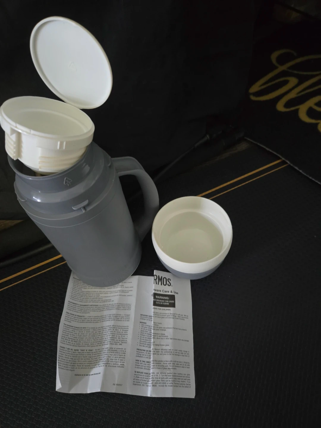 Selling a Thermos carafe with lid and care instructions. This is a grey carafe with white lids and a blue base for the cup.