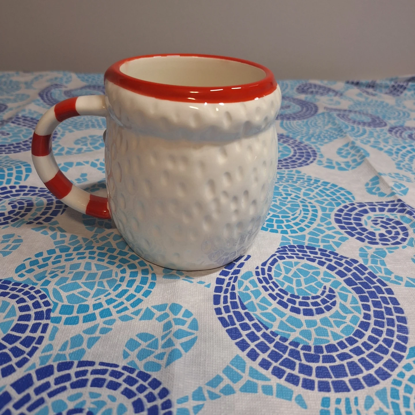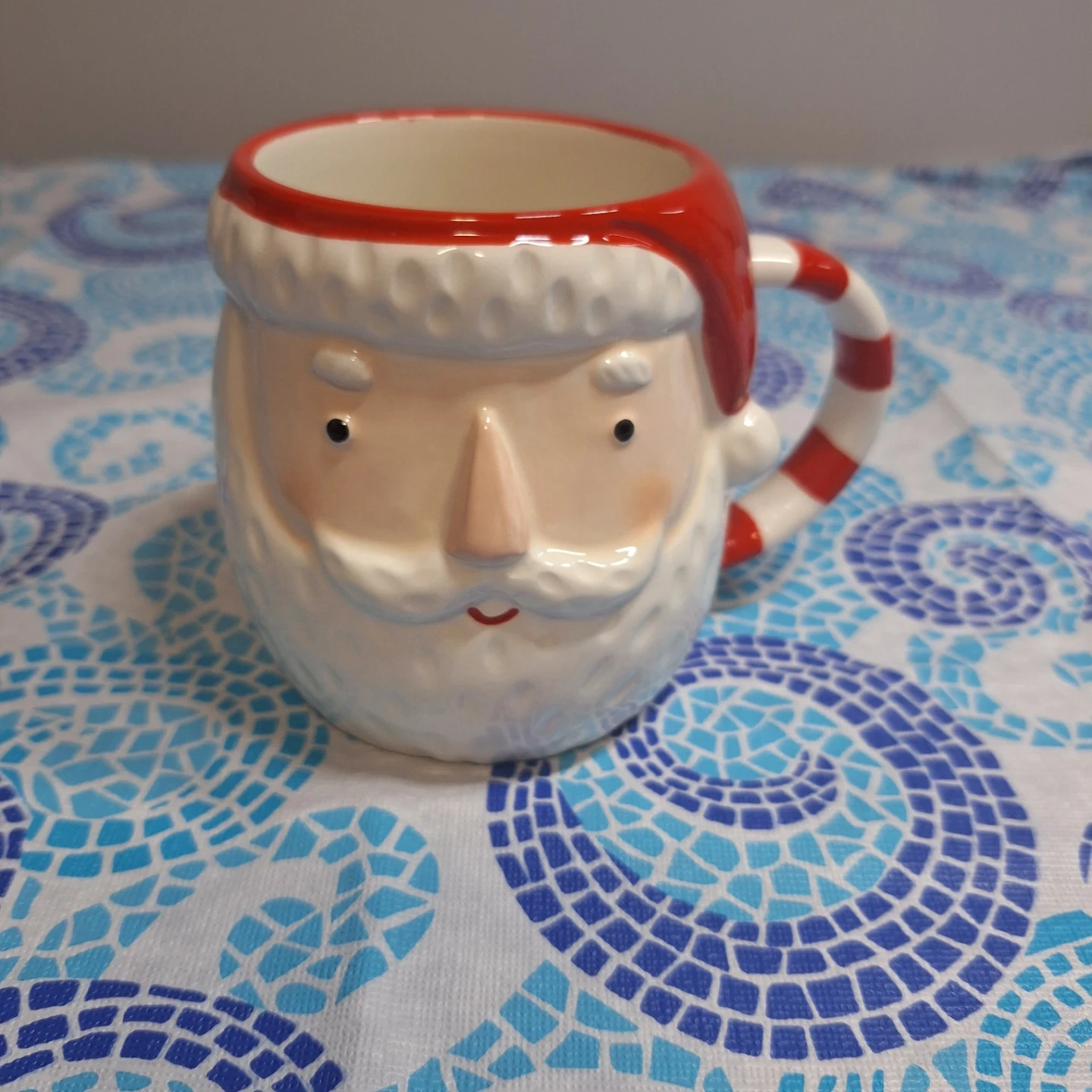 Selling a fun Santa Claus ceramic mug with a textured white body and a red and white striped handle. The mug features a cute Santa face design, perfect for holiday cheer! Great for your morning coffee or tea.