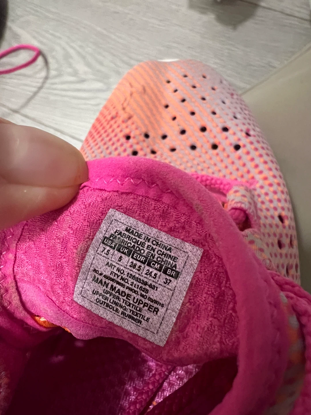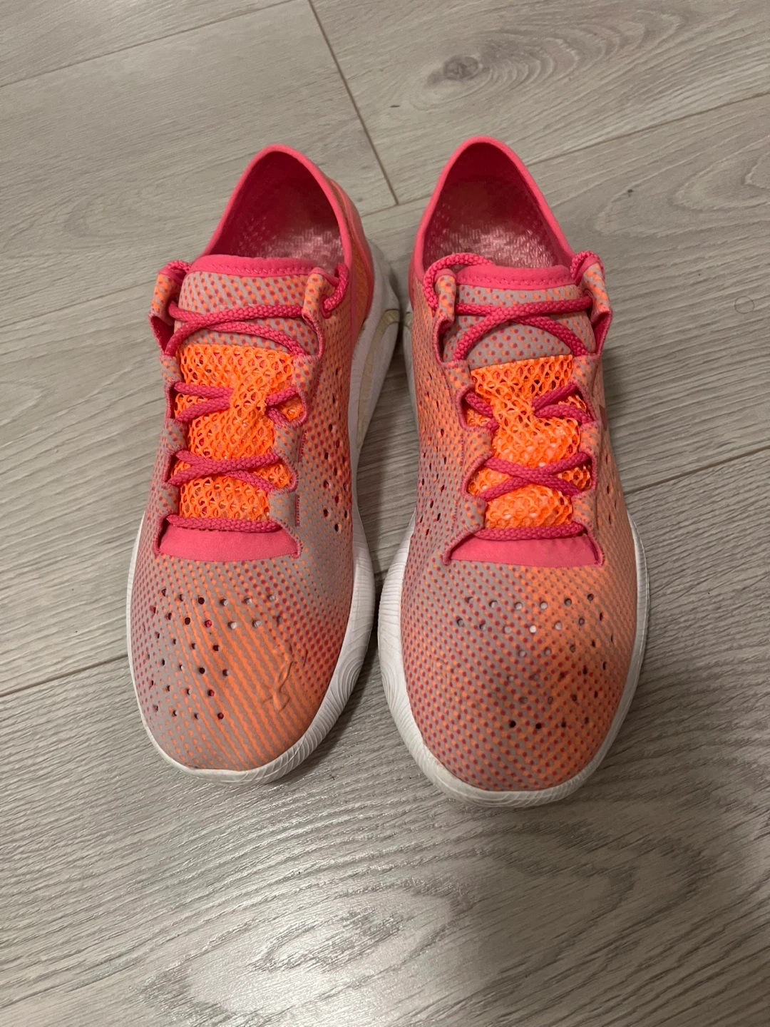 Selling Under Armour running shoes in a women's size 7.5. These shoes have a vibrant pink and orange colourway with a breathable, perforated upper. Outsole is rubber.