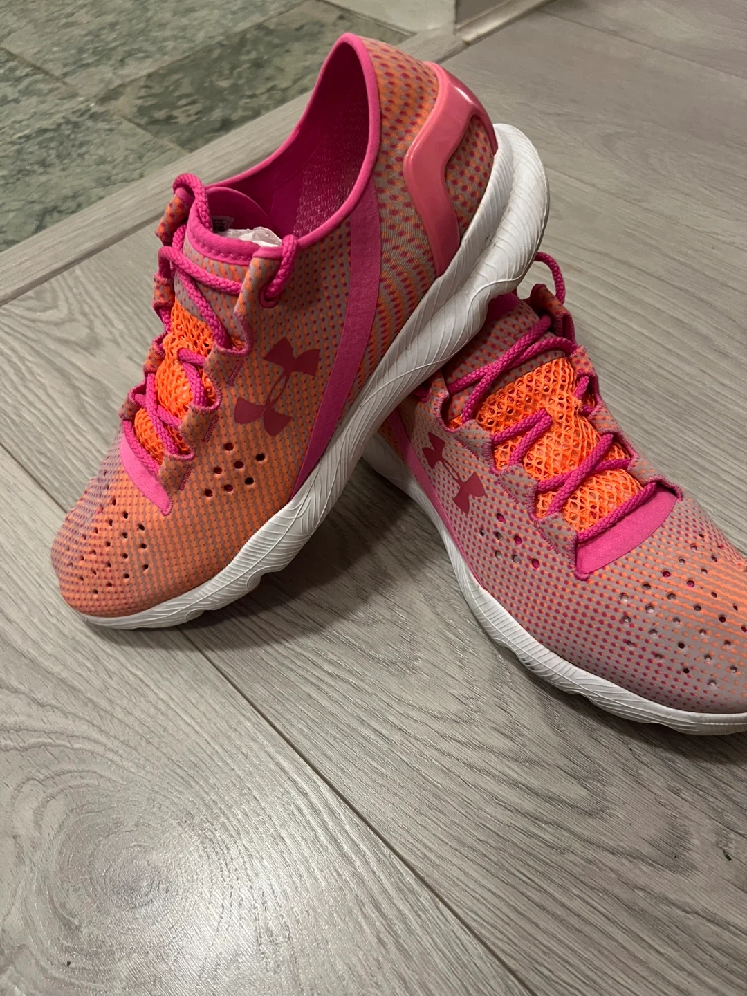 Selling Under Armour running shoes in a women's size 7.5. These shoes have a vibrant pink and orange colourway with a breathable, perforated upper. Outsole is rubber.