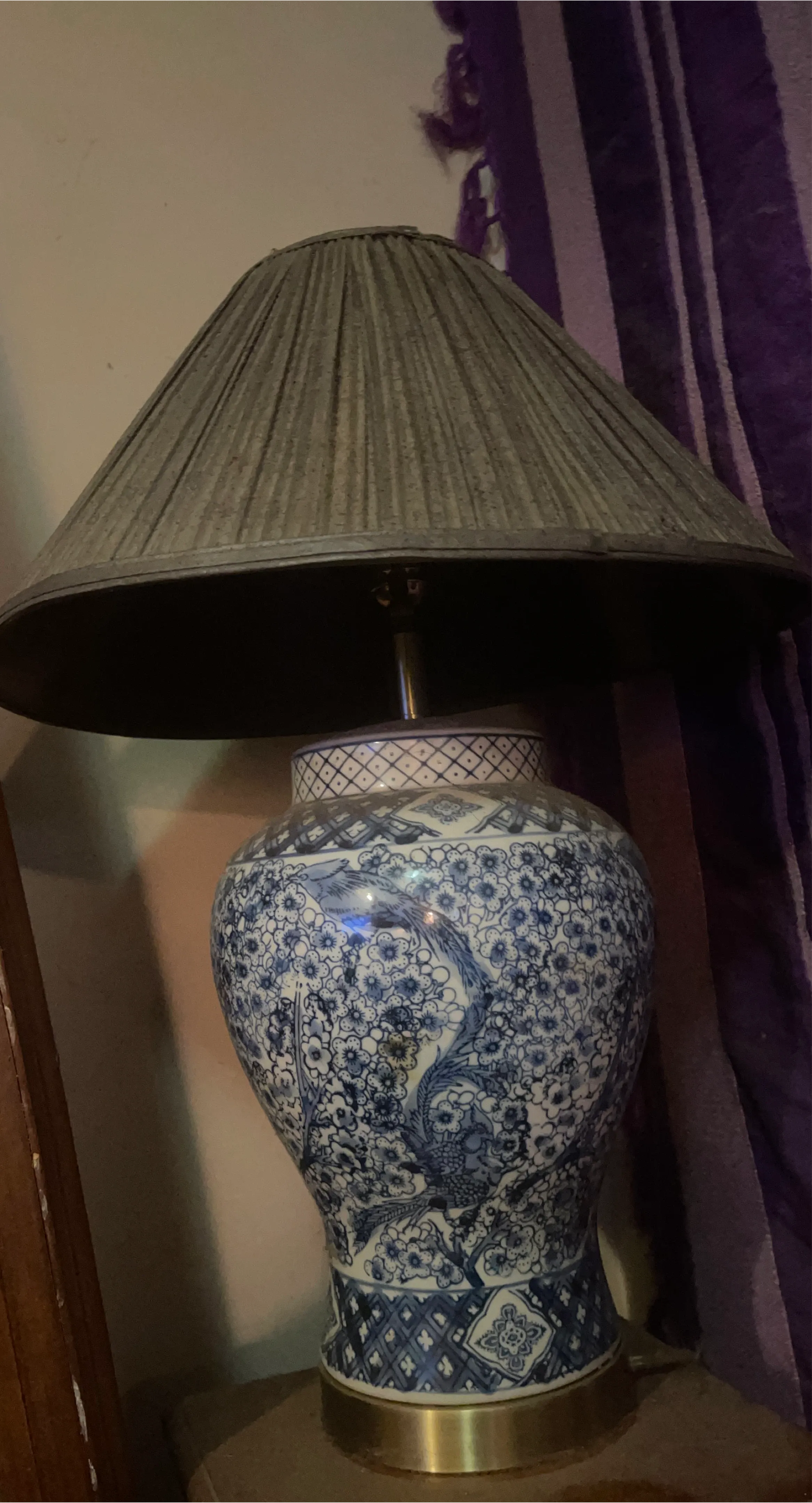 Selling a beautiful blue and white ceramic ginger jar table lamp with a pleated grey lampshade. The base features an intricate floral and bird pattern, typical of Chinoiserie style. It's a lovely decorative piece that adds a touch of elegance to any room.