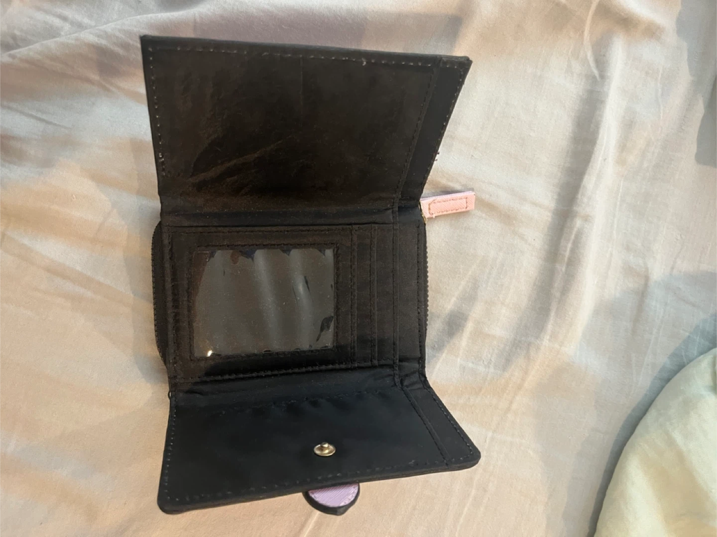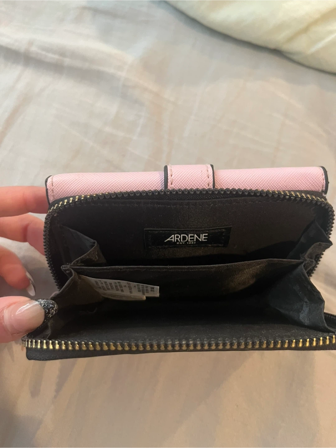 A cute pink tri-fold wallet from Ardene. It has a snap closure and multiple card slots inside. Perfect for keeping your essentials organized!