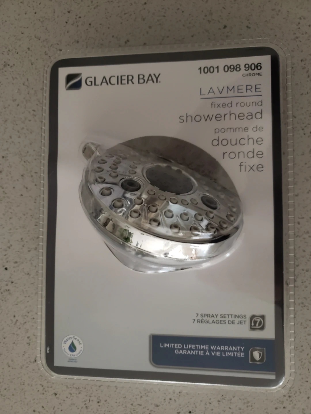 Selling a Glacier Bay Lavmere fixed round showerhead in chrome. This showerhead offers 7 spray settings and comes with a limited lifetime warranty. It's still in its original packaging. A great upgrade for your bathroom!
