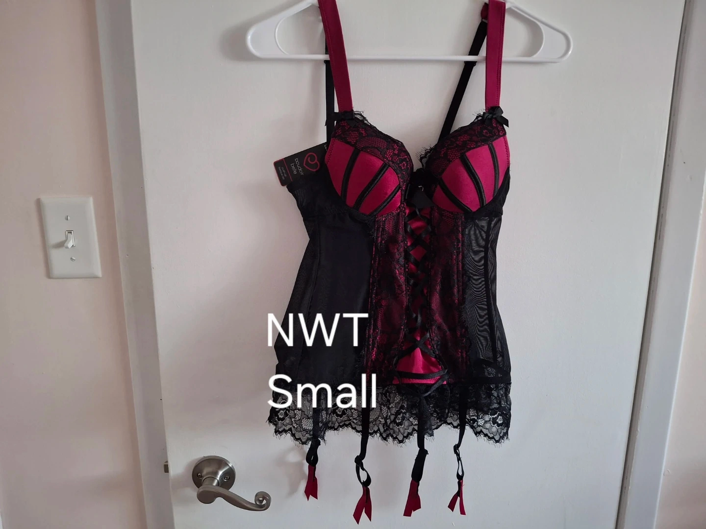 Selling a Love Your Belle black and red lace corset in size small. This NWT piece features adjustable straps and a flattering fit. It's a beautiful addition to any wardrobe!