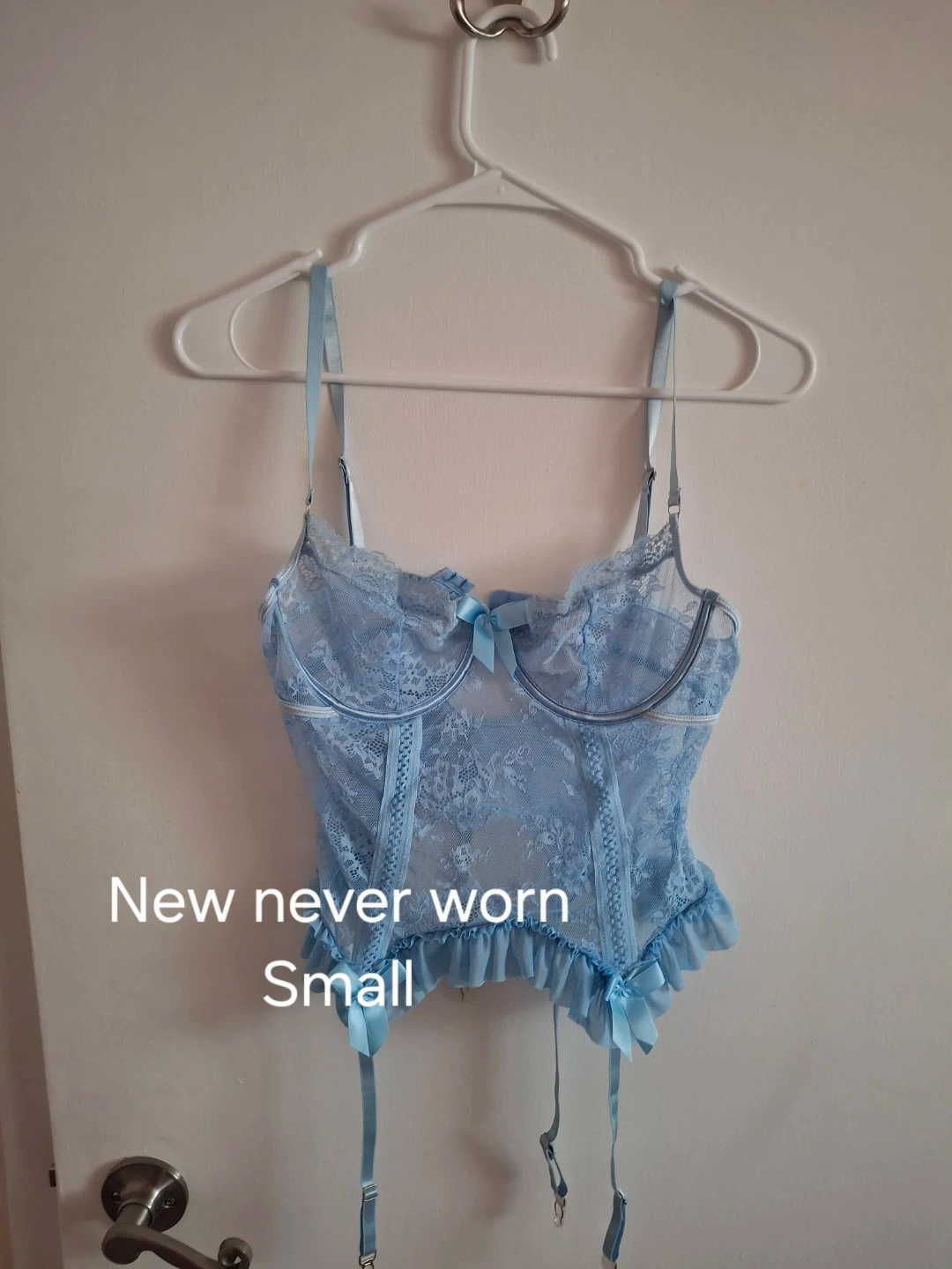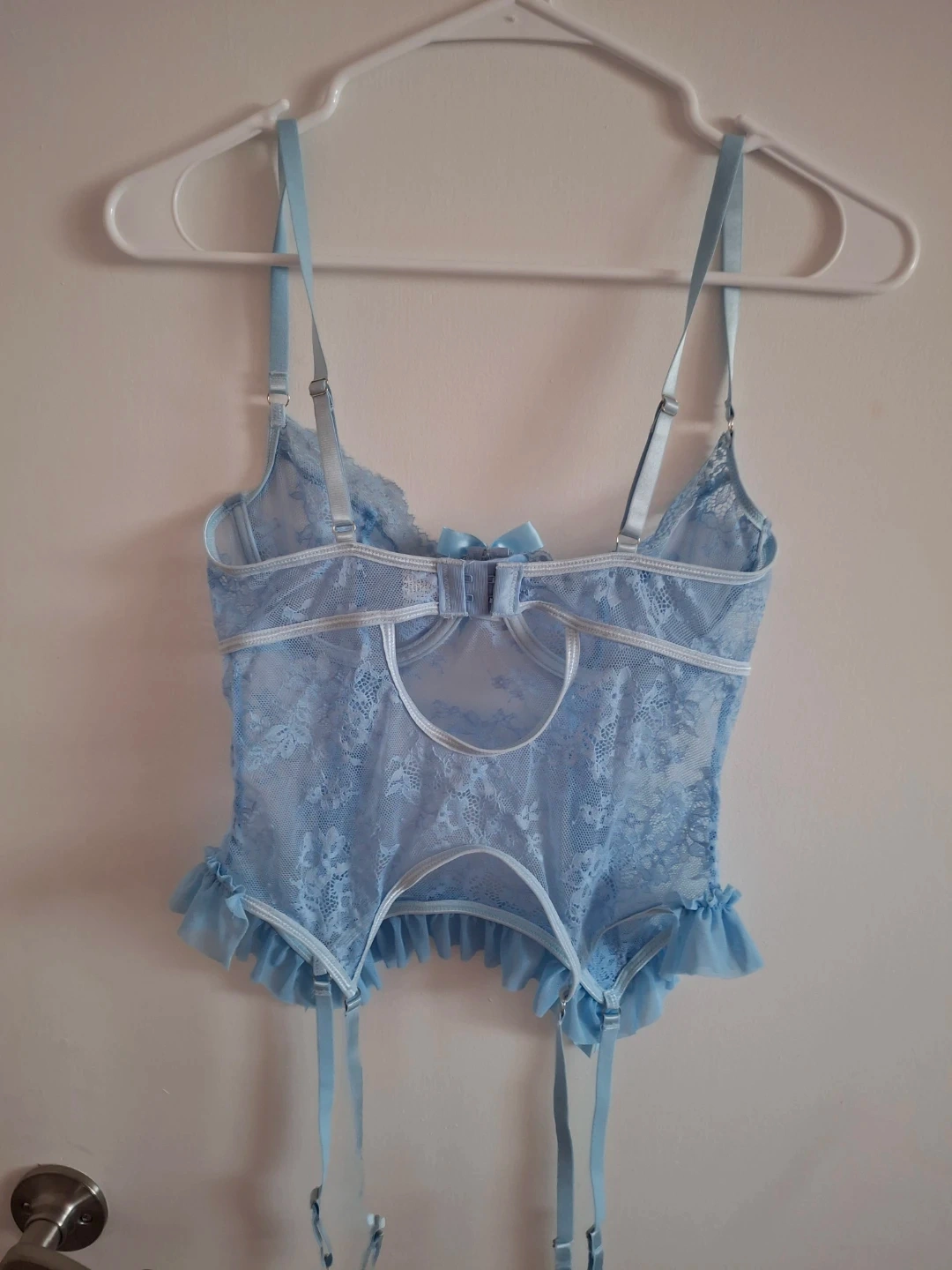 Selling a light blue lace corset with adjustable garters. It's a small size and has never been worn. Made with delicate floral lace and has a cute bow accent.