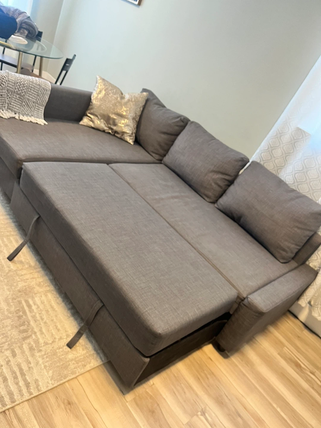 Selling a grey sectional sofa bed with a pull-out mattress and storage underneath the chaise. It's made of durable fabric and comes with decorative throw pillows. Perfect for small spaces and overnight guests!