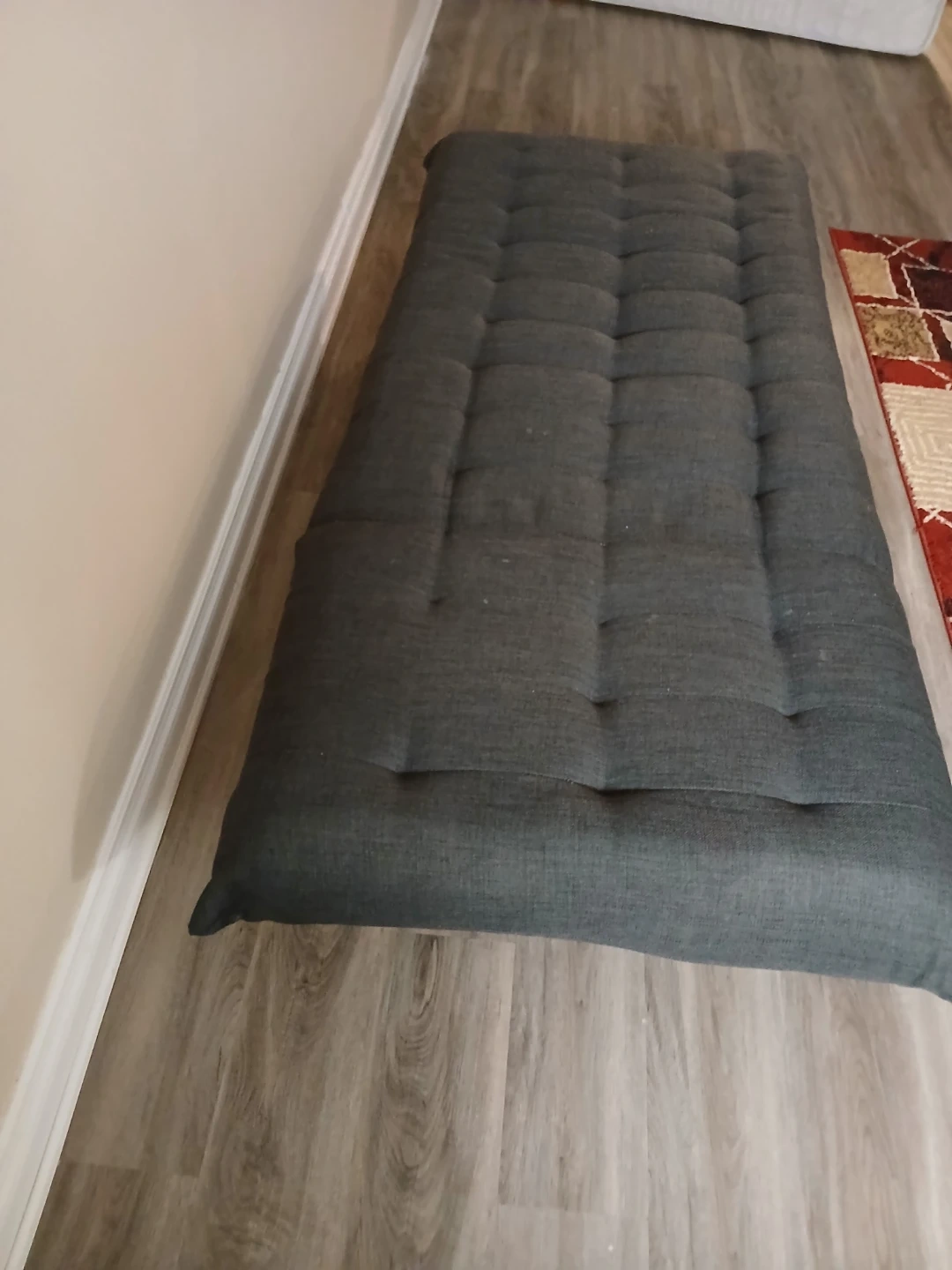 Selling a dark grey tufted daybed or futon that can be used as a couch or a bed. It features a button-tufted design and a firm seating surface. This versatile piece is great for small spaces!