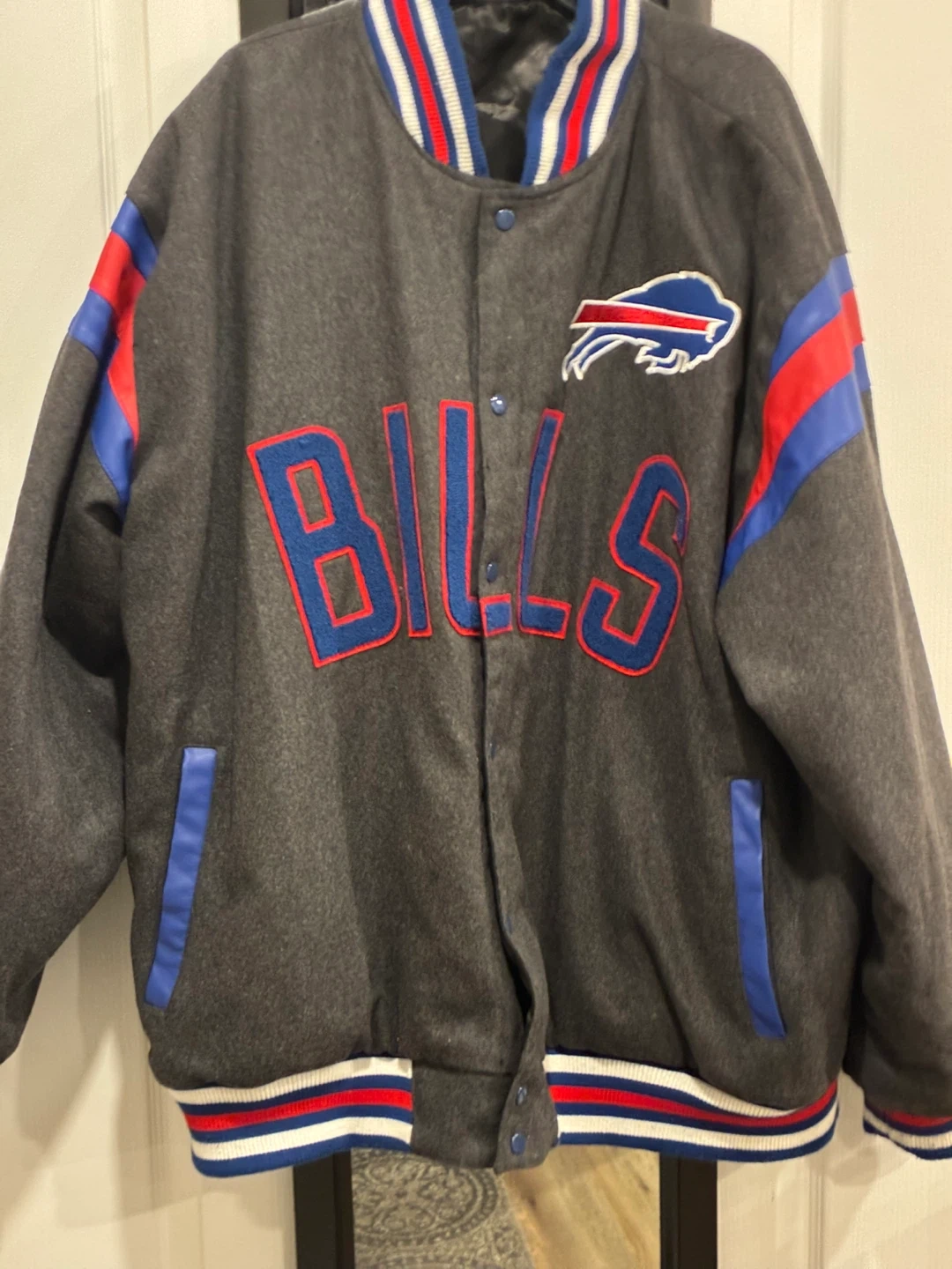 Selling a Buffalo Bills varsity jacket. Features embroidered "BILLS" on the front and a large Buffalo Bills helmet logo on the back. Classic varsity style with striped cuffs and collar. Great for any fan!