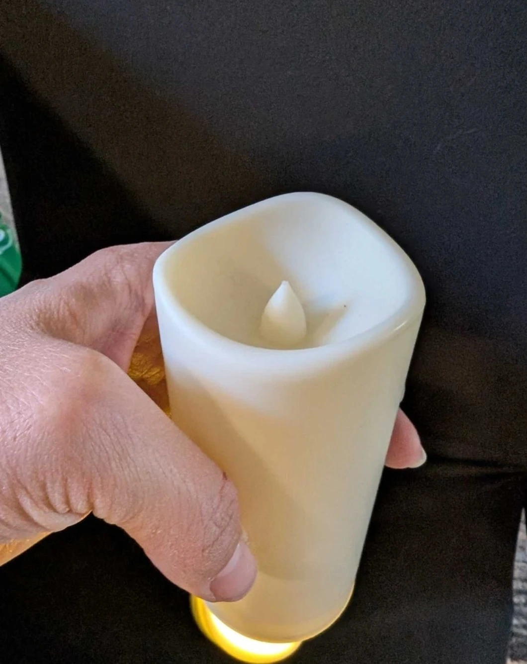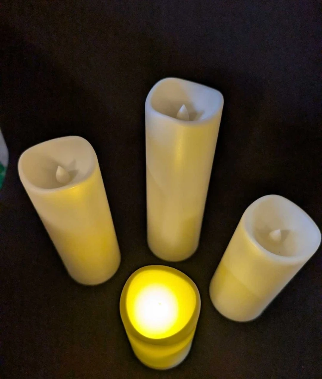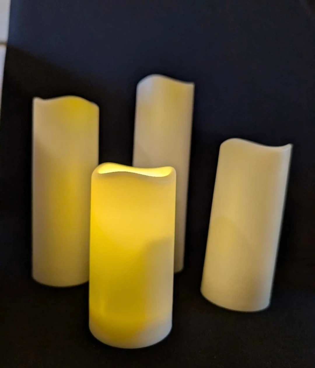 Selling a set of four LED flameless pillar candles. These candles provide a warm, flickering glow without any real flame. They are made of a durable plastic material and are battery-operated. Add a safe and cozy ambiance to any room!