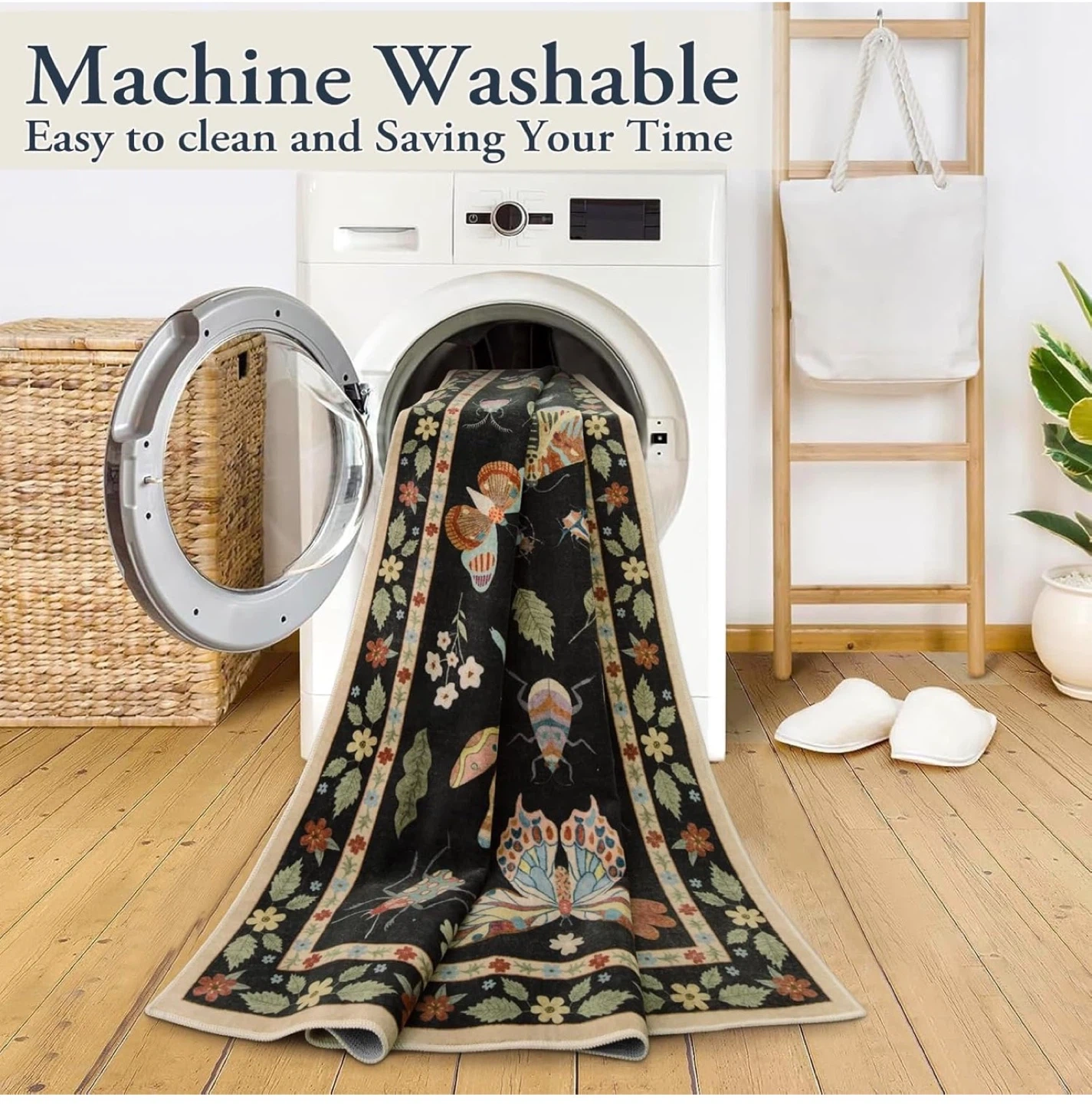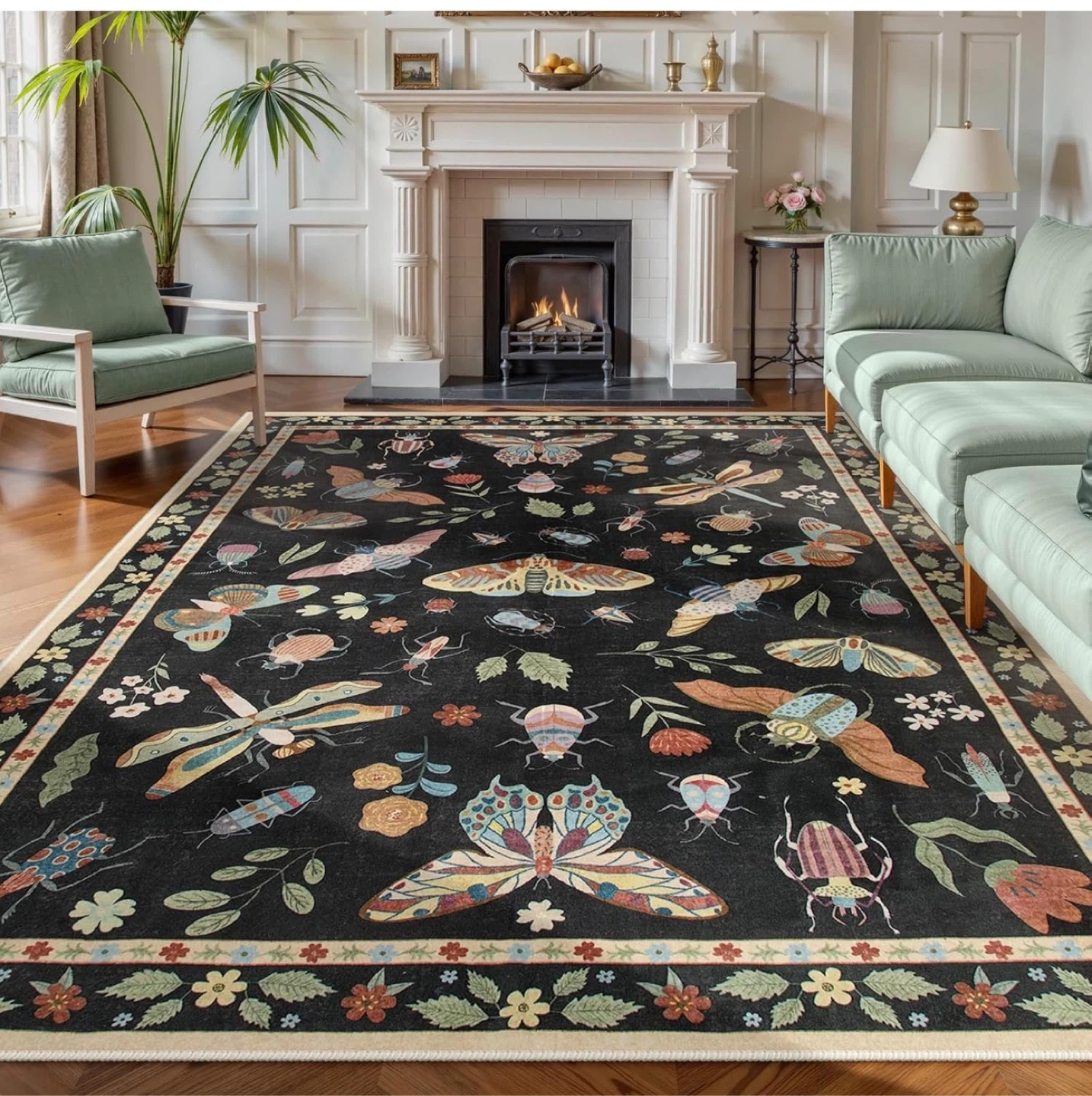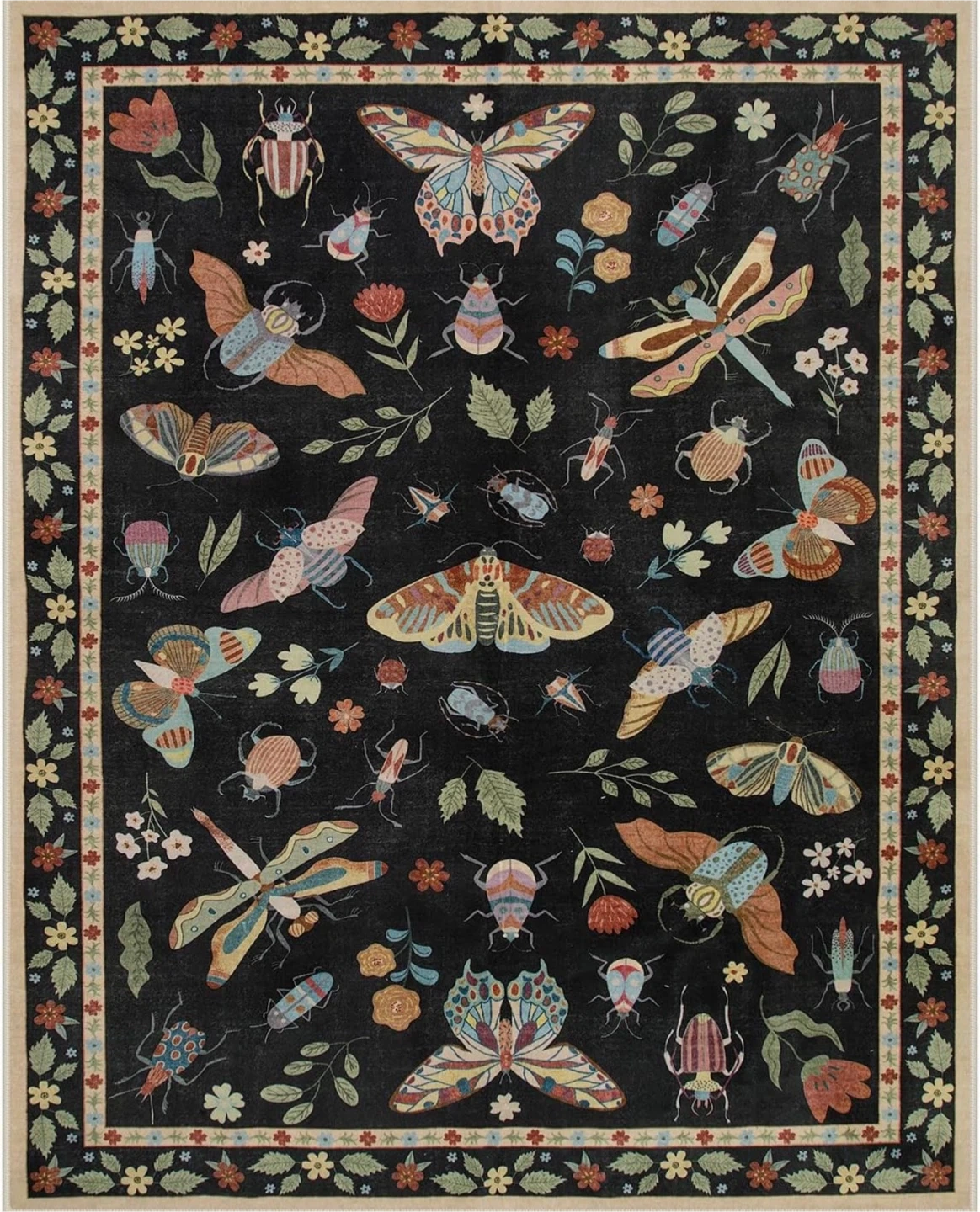Selling a black area rug featuring a vibrant pattern of butterflies, dragonflies, beetles, and flowers. This rug has a soft surface and non-slip backing. It's easily foldable for storage and has a reinforced edge. Perfect for adding a unique touch to any room!