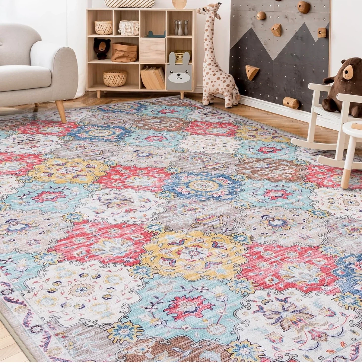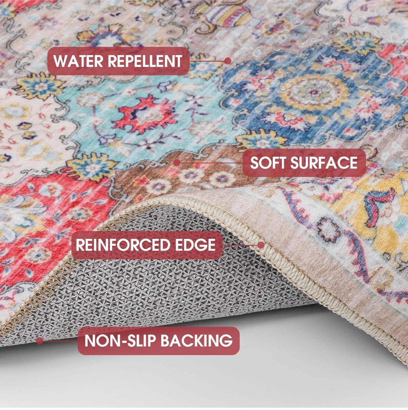 Selling a beautiful vintage-style area rug. This rug features a soft surface, water-repellent material, reinforced edges, and a non-slip backing for safety. Adds a cozy touch to any room!