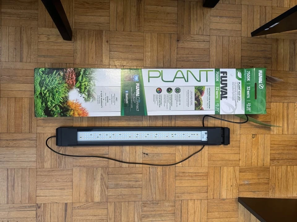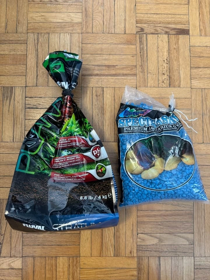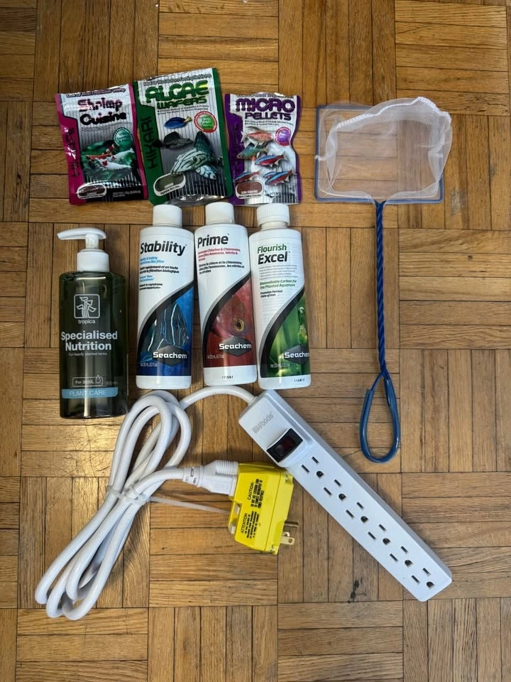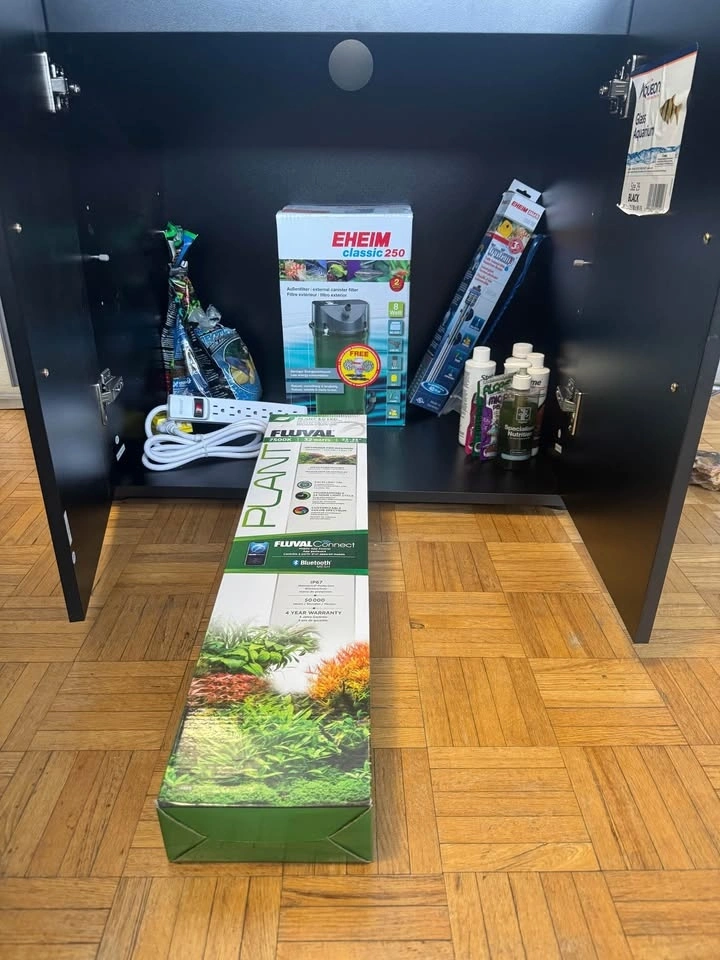 Everything you need to start your freshwater aquarium! Lightly used for less than three months, then professionally cleaned. Includes multi-colour LED light panel, purpose-built and assembled cabinet, powerful external canister filter, and effective submersible heater. Plant/shrimp substrate and blue rocks. Power bar with Ground Fault Circuit Interrupter for added safety. Opened bottles of plant food, water conditioner, liquid carbon. Opened packets of tropical fish food, shrimp food, and algae wafers. Over 18 months remaining on extended, transferable warranty on LED light panel. Buyer must retrieve all items at once.