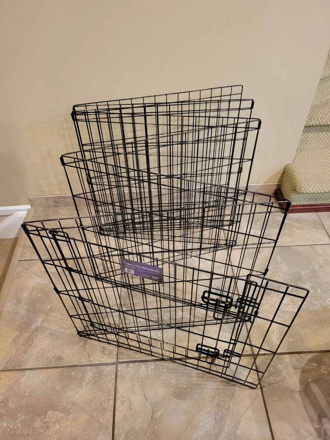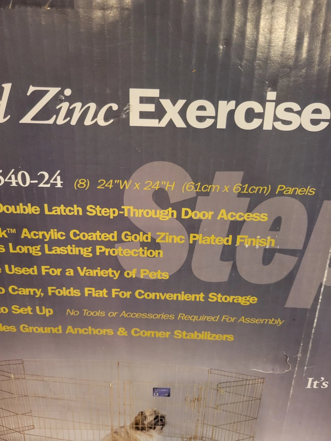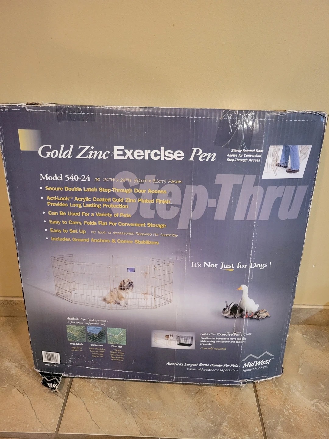 Selling a MidWest Gold Zinc Exercise Pen with 8 panels, each measuring 24" W x 24" H. This pen features a secure double latch step-through door and an acrylic coated gold zinc plated finish for durability. It folds flat for convenient storage and sets up easily with no tools required. Includes ground anchors and corner stabilizers. It's perfect for a variety of pets!