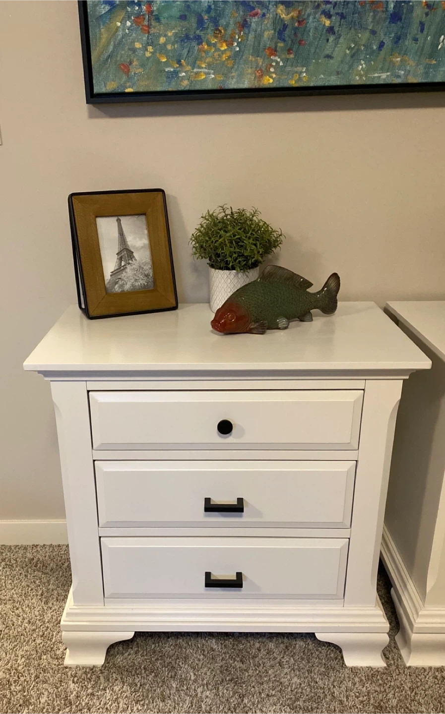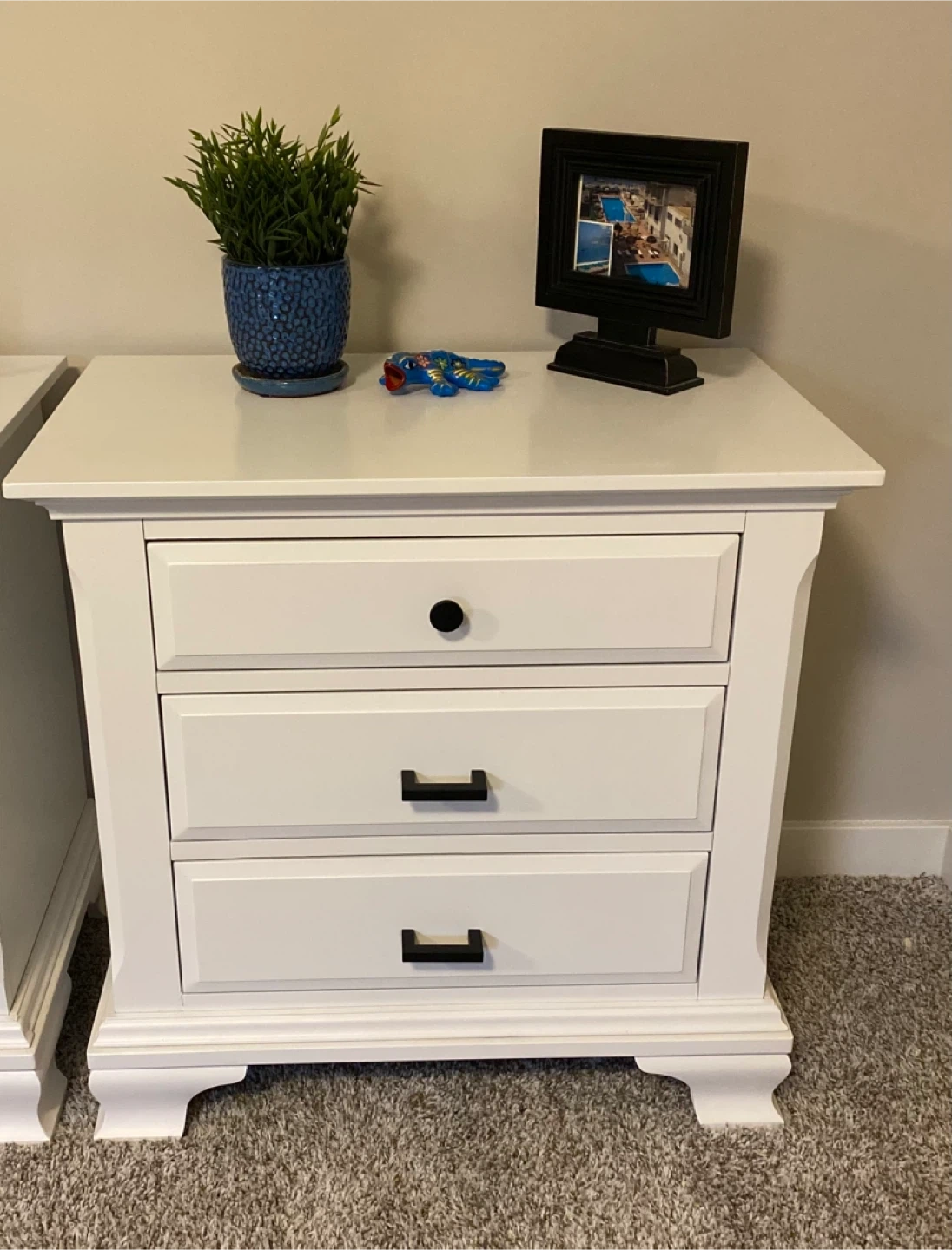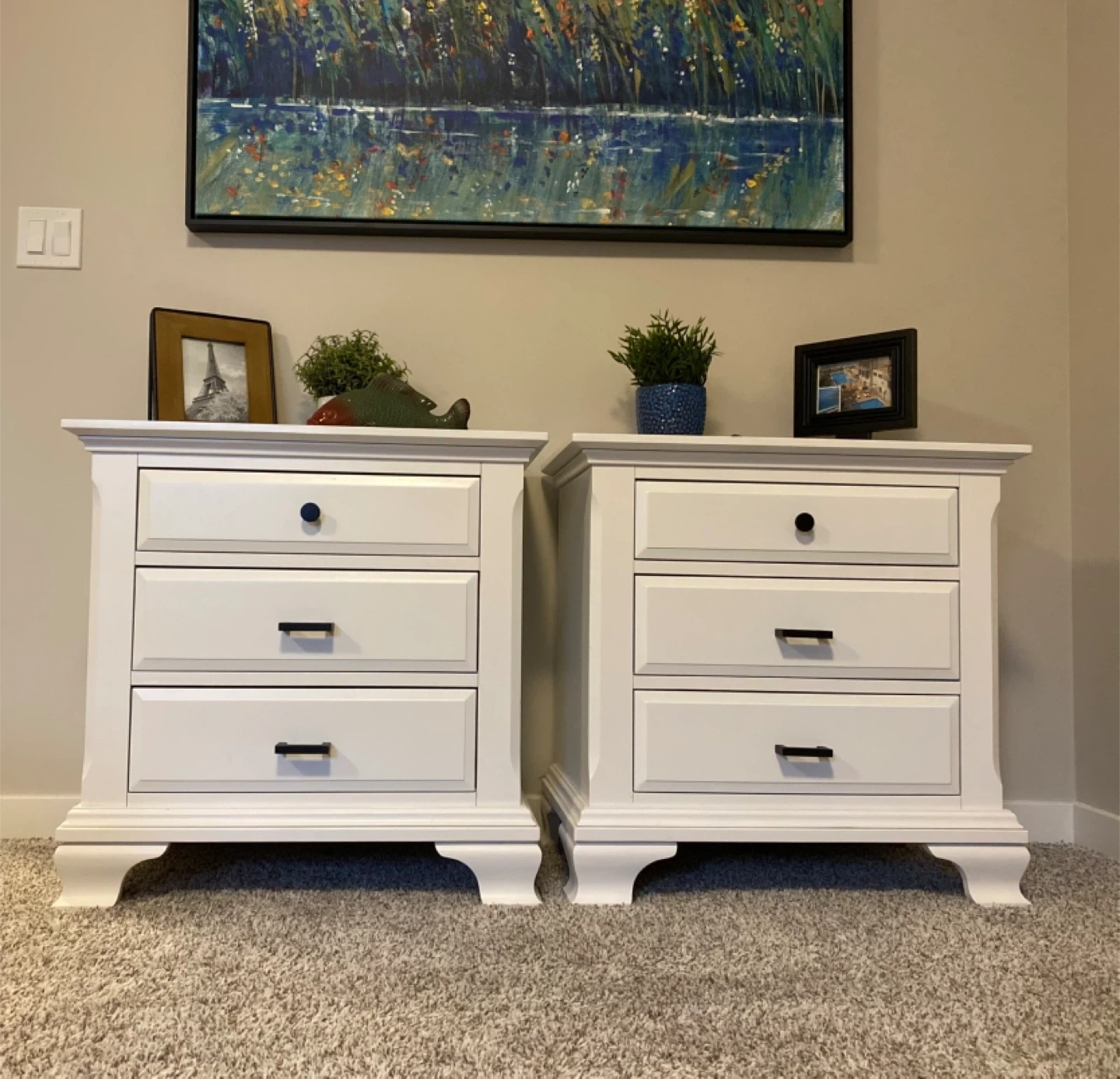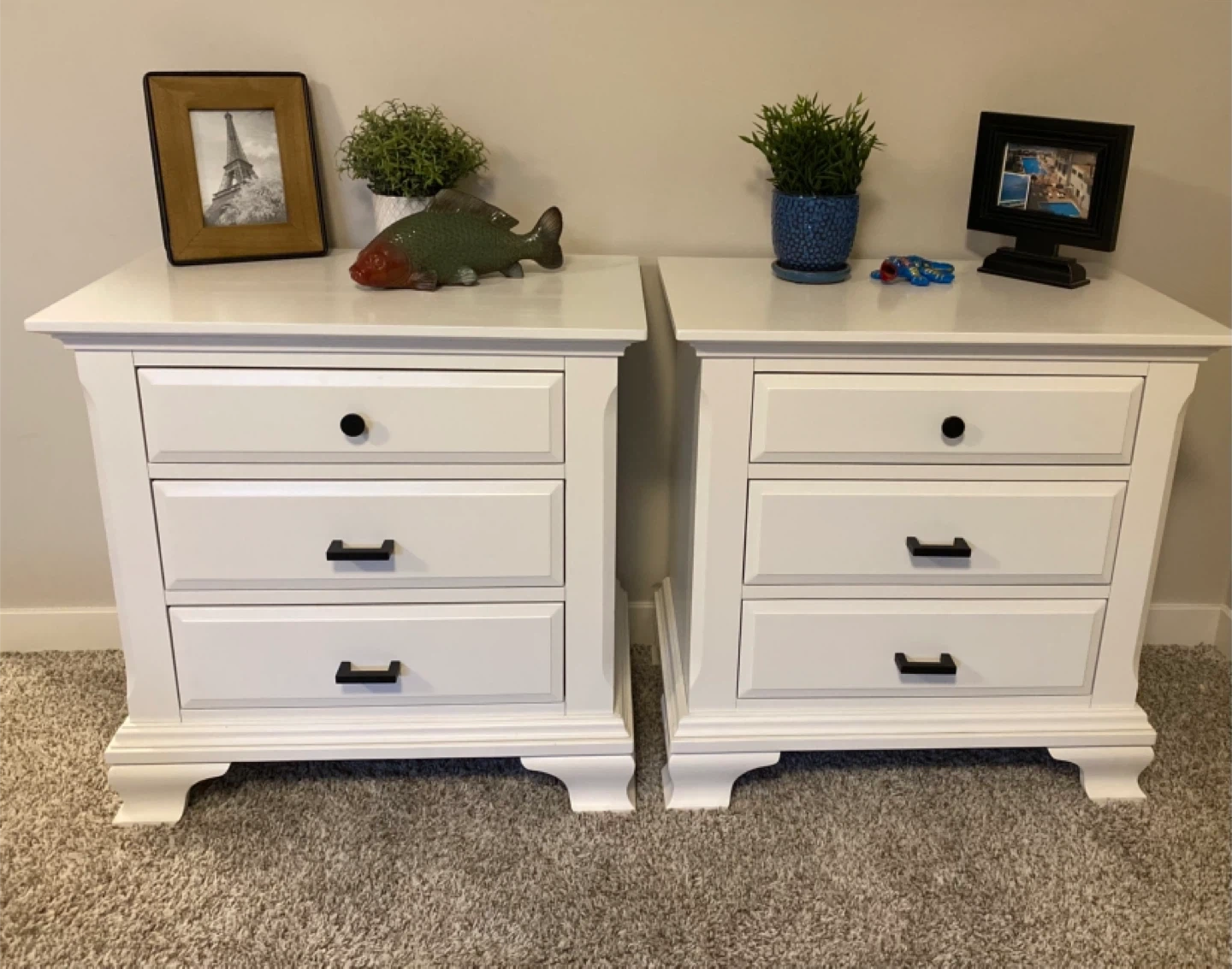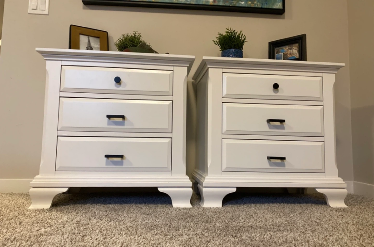 King sized White Nightstands with black hardware