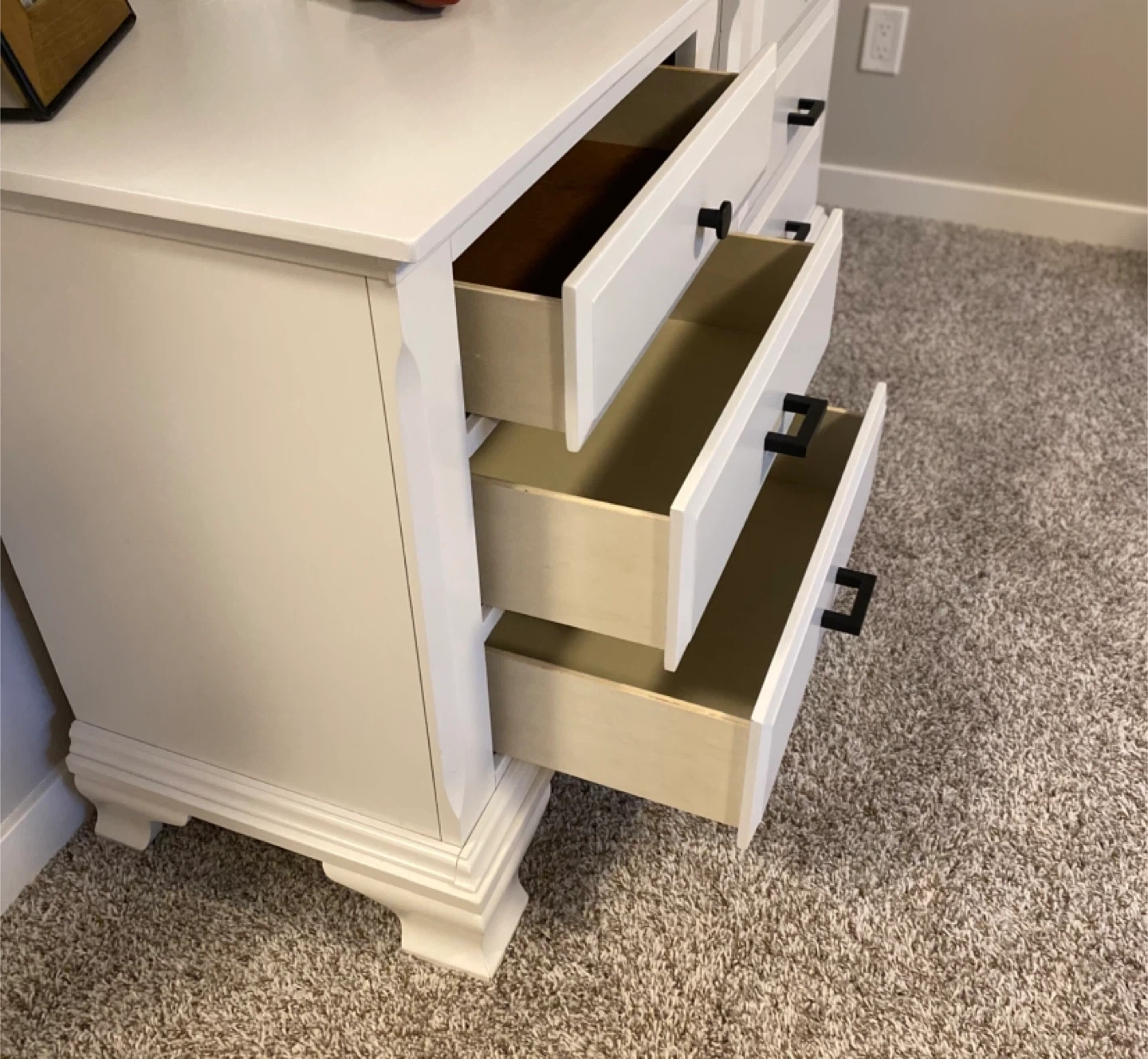 Featuring three easy open/ close dovetailed drawers with brand new black hardware