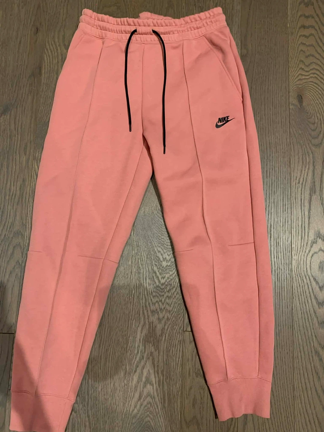 Selling Nike Tech Fleece joggers in a soft pink colour. They are a size medium and feature a drawstring waist and zippered pockets. These comfy pants are perfect for everyday wear!