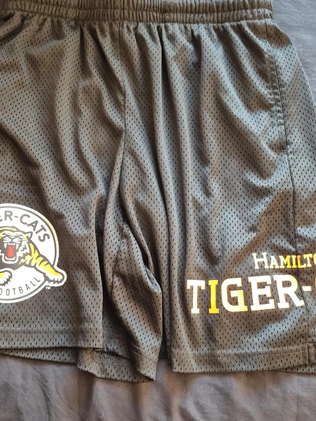 Selling New Era Hamilton Tiger-Cats football shorts in black. Size medium. Features the Tiger-Cats logo and "Hamilton Tiger-Cats" text. Great for any fan!