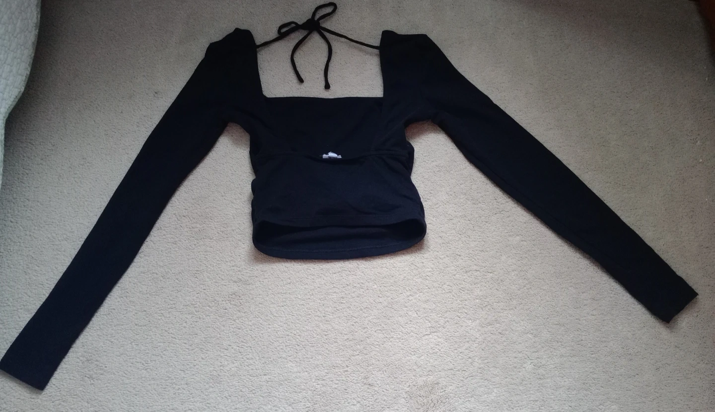 Selling a black long sleeve crop top from Garage-XS. It's made with 95% cotton and 5% spandex for a comfy fit. Features a stylish square neckline and a tie-back detail. Great for layering or wearing on its own!