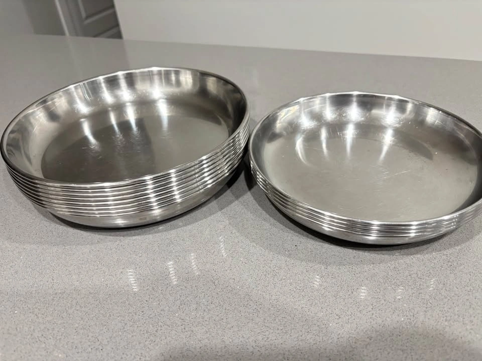 Set of stainless steel plates in good condition. Includes: 8 large plates, 5 medium plates. Durable, rust-resistant, and easy to clean. Great for everyday home use, parties, camping, or as extra serving plates. Normal light surface marks from regular use, no dents or damage. Selling as a set only.