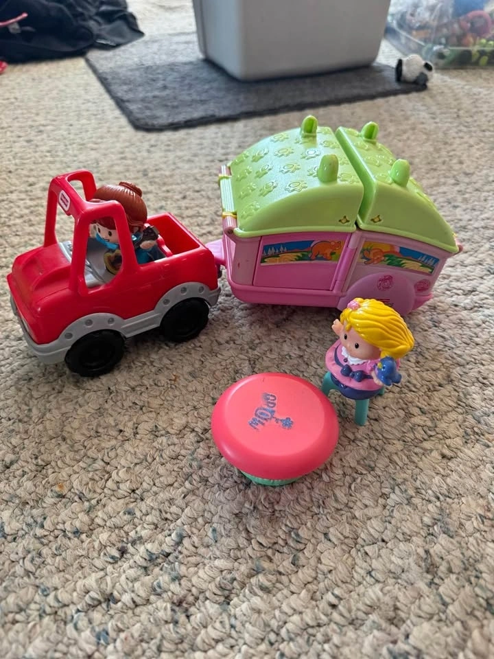 This set includes a Little People pop-up camper and truck with people. A table and chair are also included for free, though they are not Little People brand.