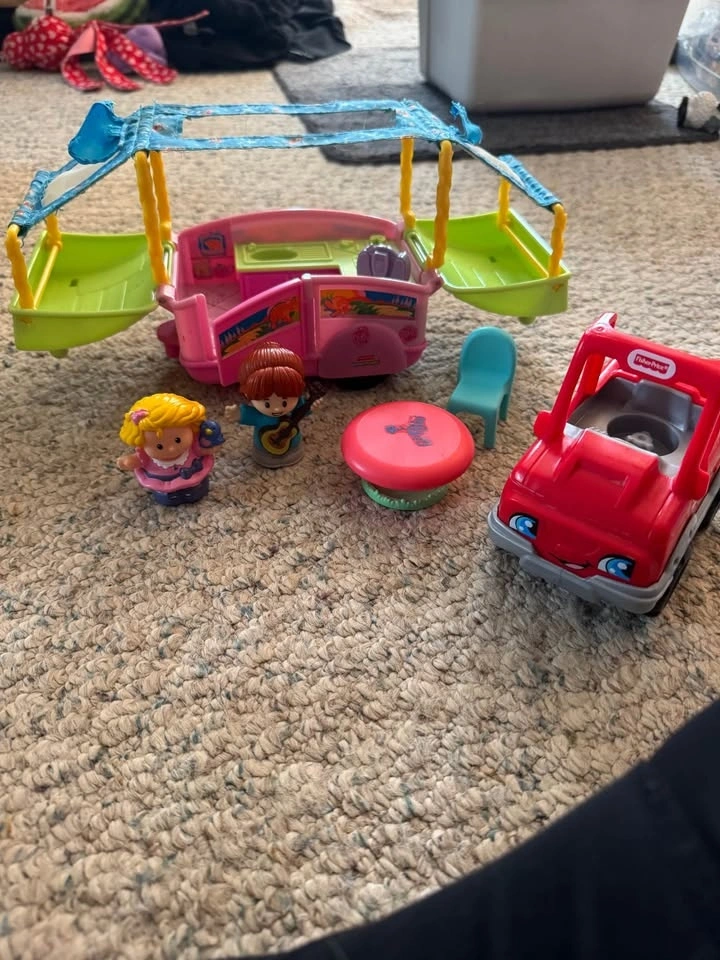 This set includes a Little People pop-up camper and truck with people. A table and chair are also included for free, though they are not Little People brand.