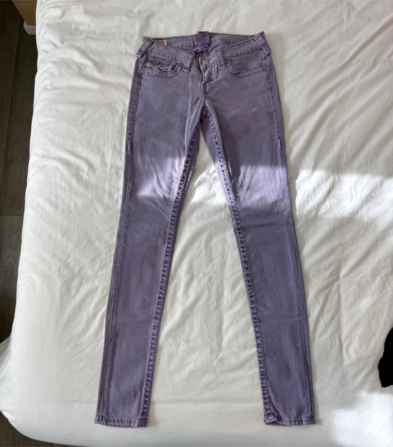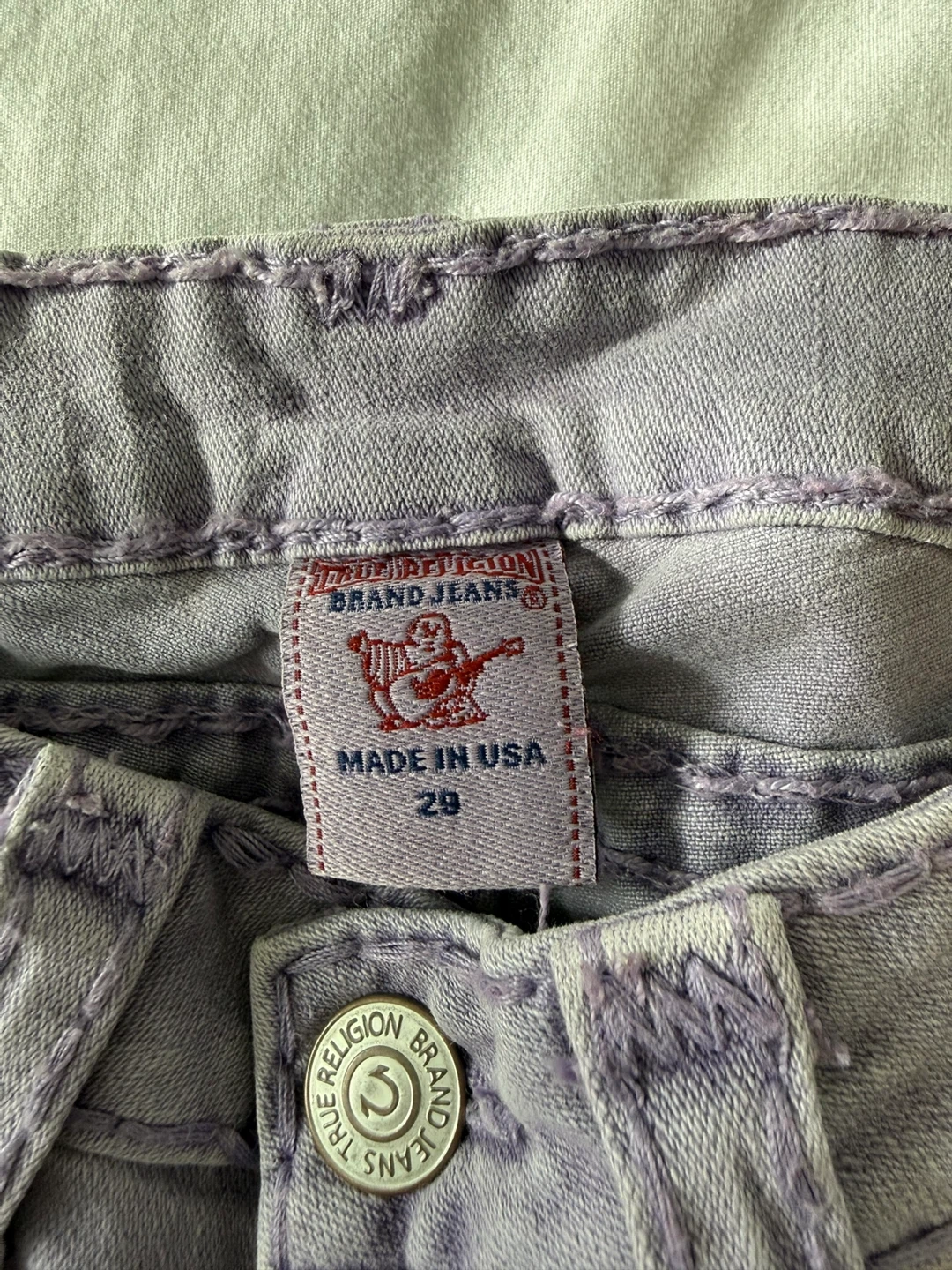 Selling True Religion Brand Jeans in a lovely light purple colour. These jeans are a size 29 and were made in the USA. They have the classic True Religion stitching and button detail. A great pair of jeans for any wardrobe!