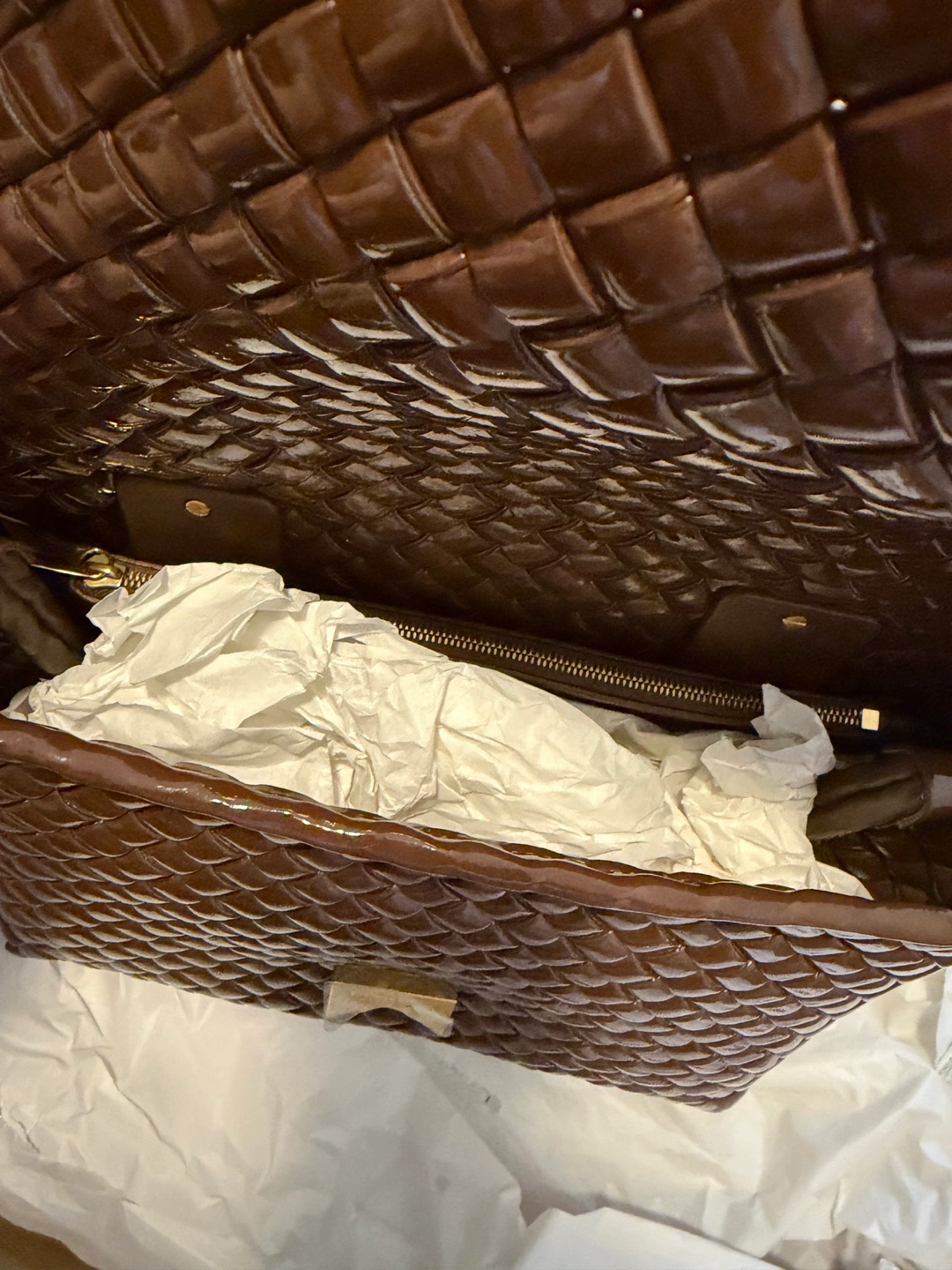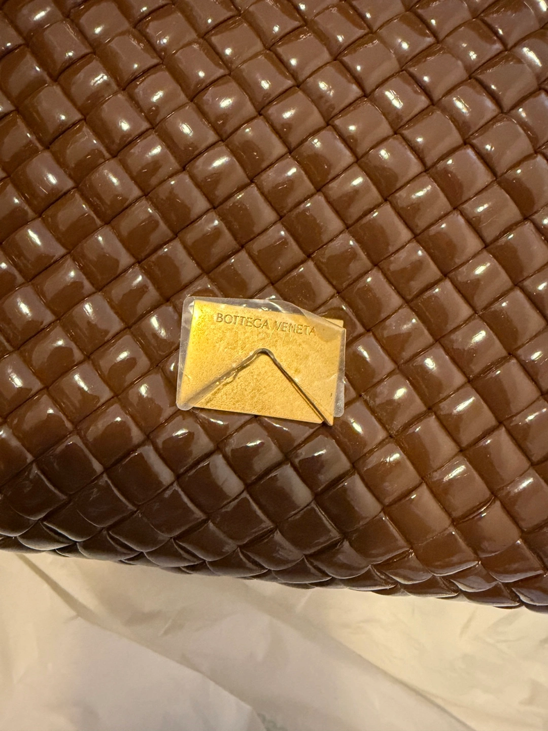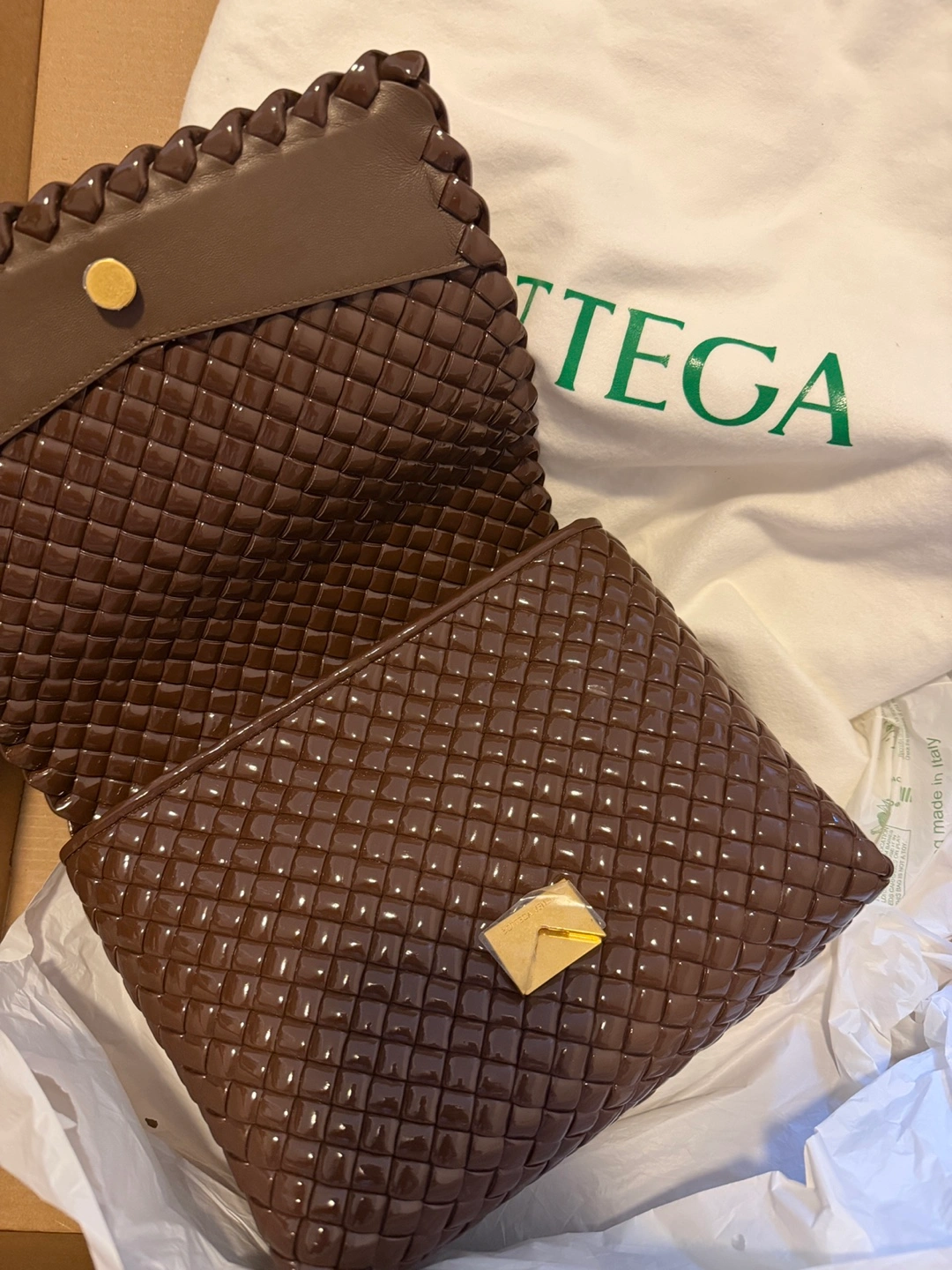 Selling a Bottega Veneta Intrecciato shoulder bag in a rich brown color. This stylish bag features the iconic woven design and is crafted from patent leather for a glossy finish. It includes the original dust bag, making it a great find!
