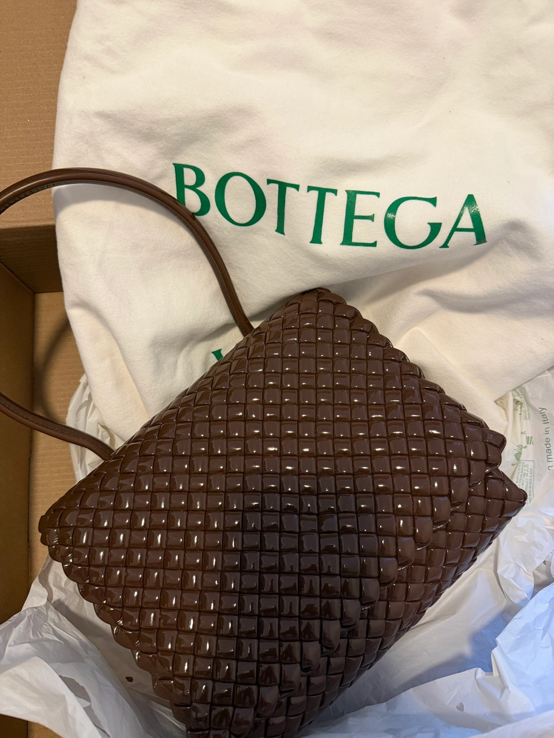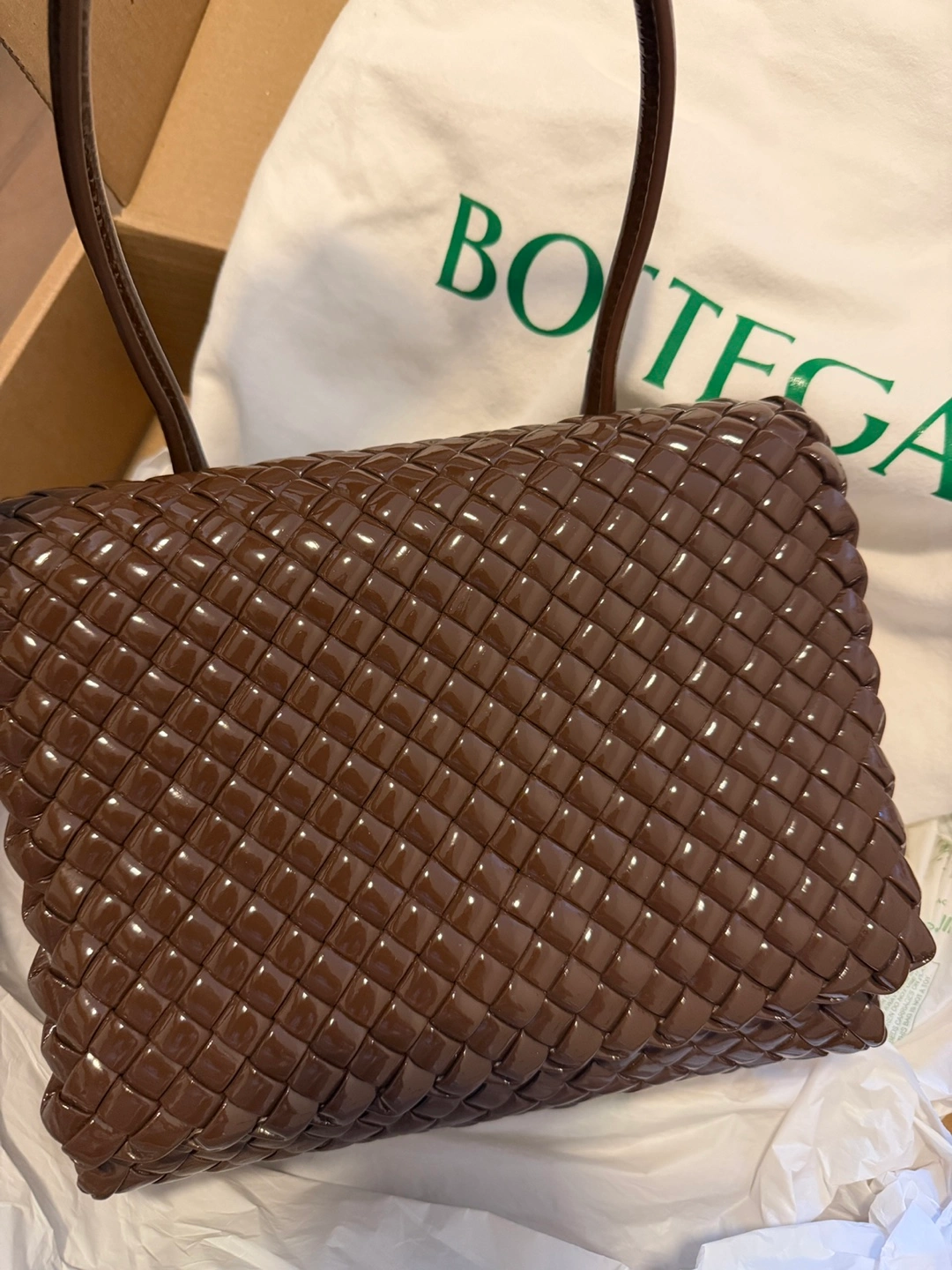 Selling a Bottega Veneta Intrecciato shoulder bag in a rich brown color. This stylish bag features the iconic woven design and is crafted from patent leather for a glossy finish. It includes the original dust bag, making it a great find!