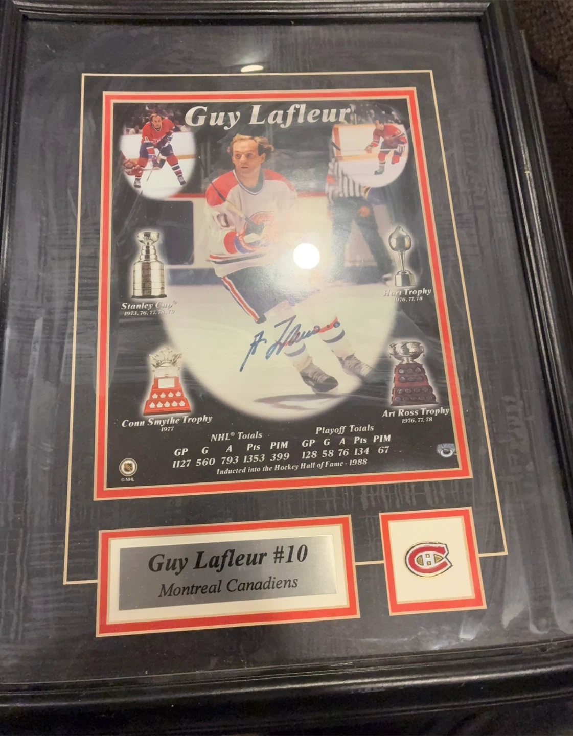 Selling a framed piece celebrating Montreal Canadiens legend Guy Lafleur, featuring his photo and stats. Includes multiple trophies and his autograph. A great item for any hockey fan!