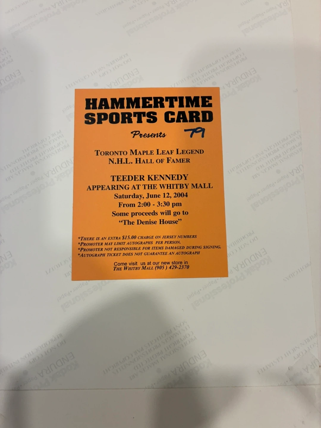 Selling a framed photograph of Toronto Maple Leafs legend Teeder Kennedy. This item features his autograph, authenticated by Hammertime Sports Card. It was presented at an event on June 12, 2004. A great piece for any hockey fan!