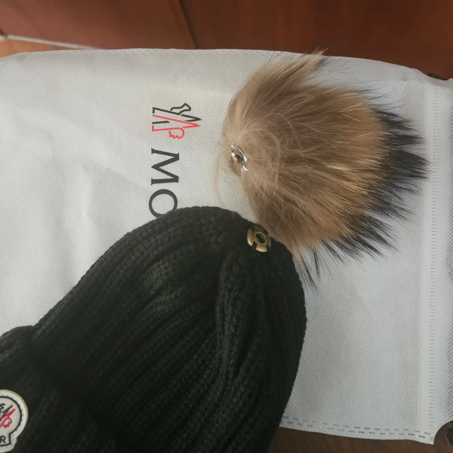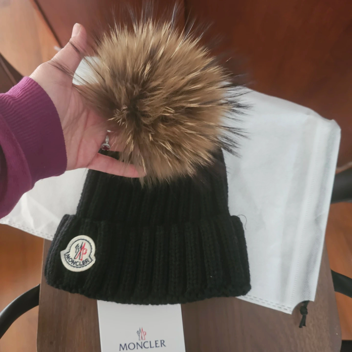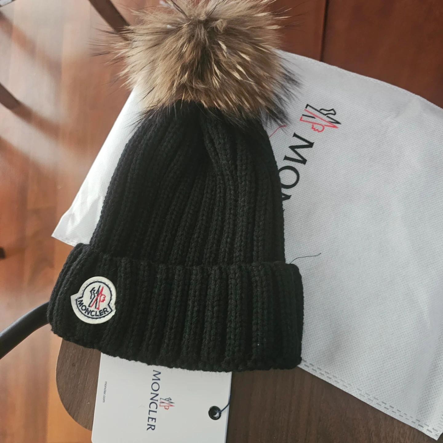 Selling a black Moncler beanie with a large, natural fur pom pom. It's made from a thick, ribbed knit material. Comes with the original dust bag and tag. A stylish and warm accessory!