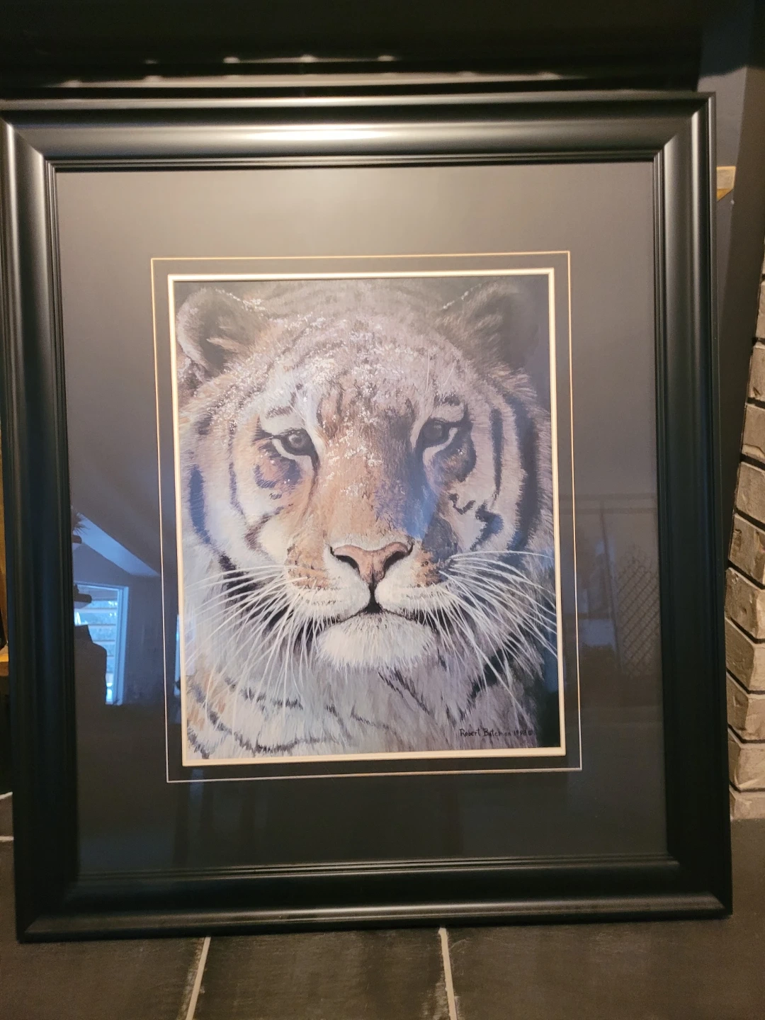 Selling a framed art print of a tiger, signed by artist Robert Bateman. The print is professionally matted and framed in a black wood frame. This piece is a stunning depiction of wildlife. A beautiful addition to any home!