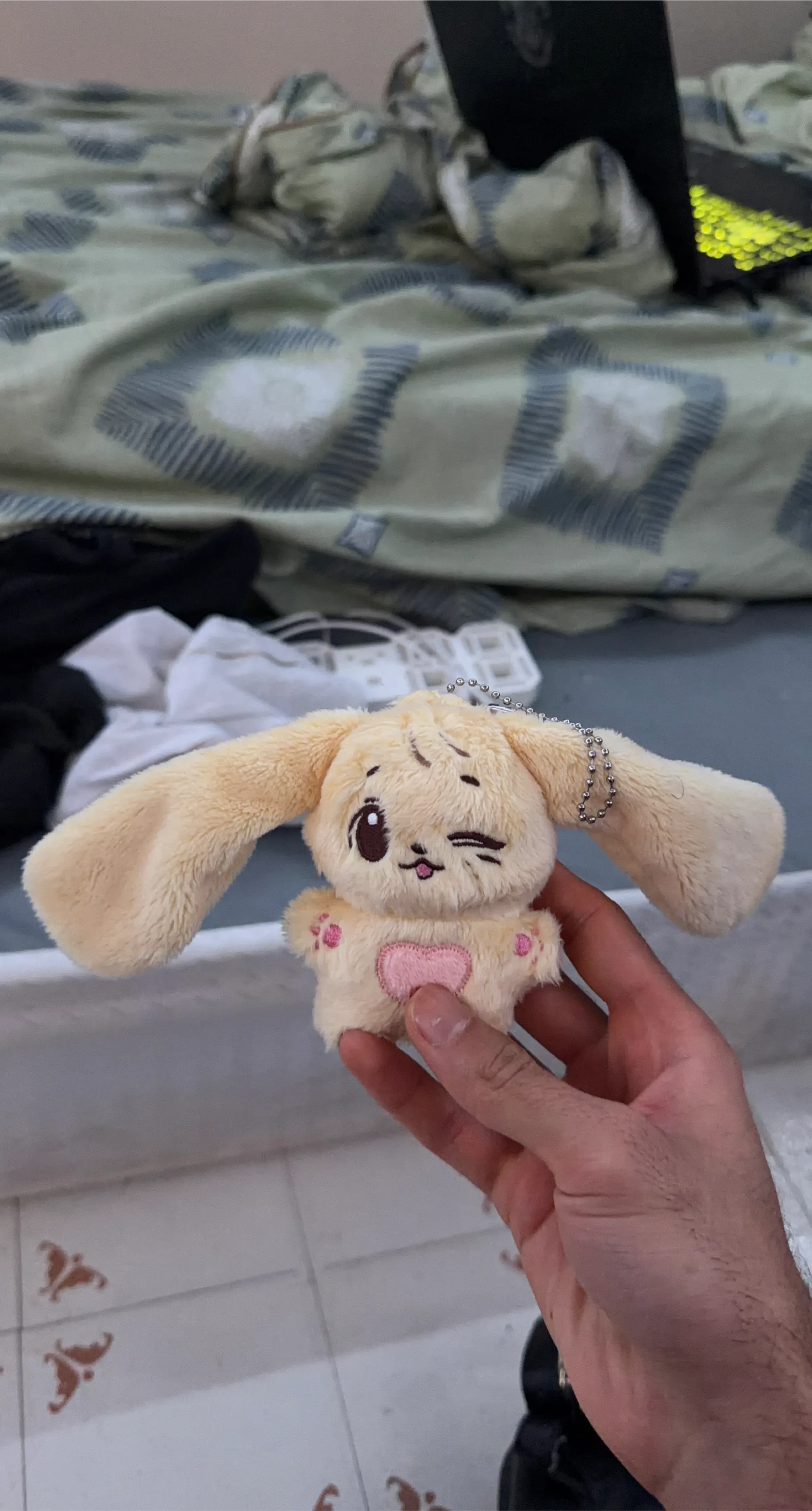 Super cute yellow bunny plush with a pink heart detail. Features embroidered eyes and a wink. Comes with a silver ball chain for easy attachment. Perfect for bags or backpacks!