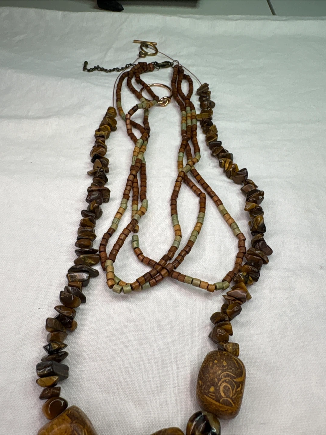 A copper ring size 8.25, and a triple stranded wood beaded necklace is included.
