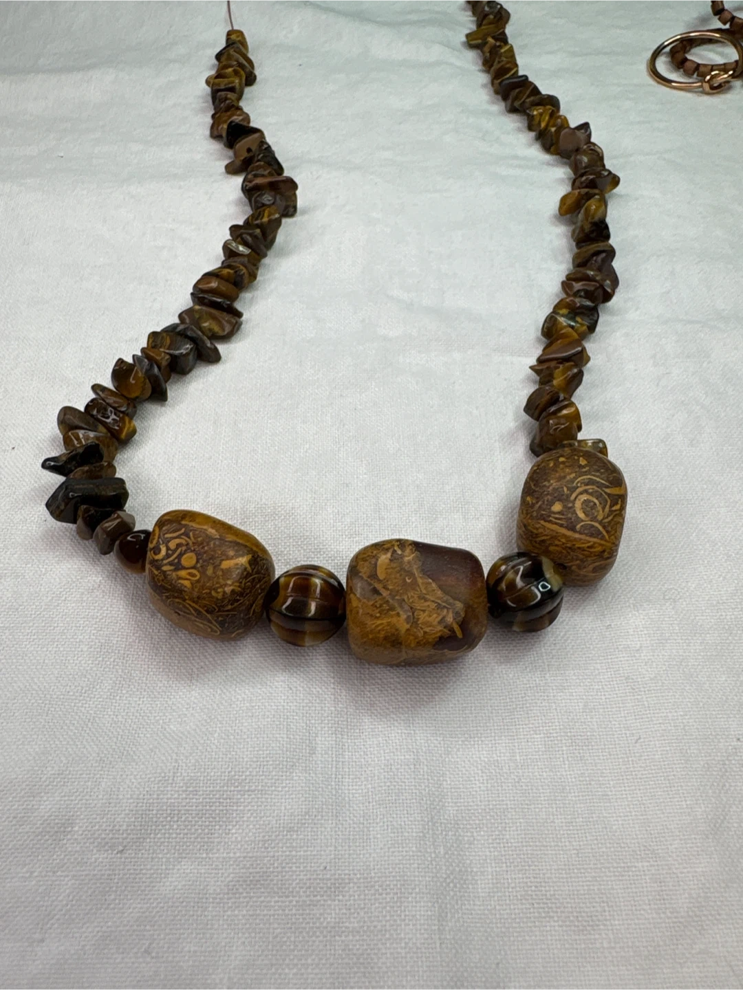 This unique necklace features a mix of natural tiger's eye chip beads and carved calligraphy stone( Miriam stone). Miriam stone is found in the Himalayas, India. Made of hematite, mud, and plants. On a copper wire with a toggle clasp for easy wear. A lovely statement piece for any jewellery collection!