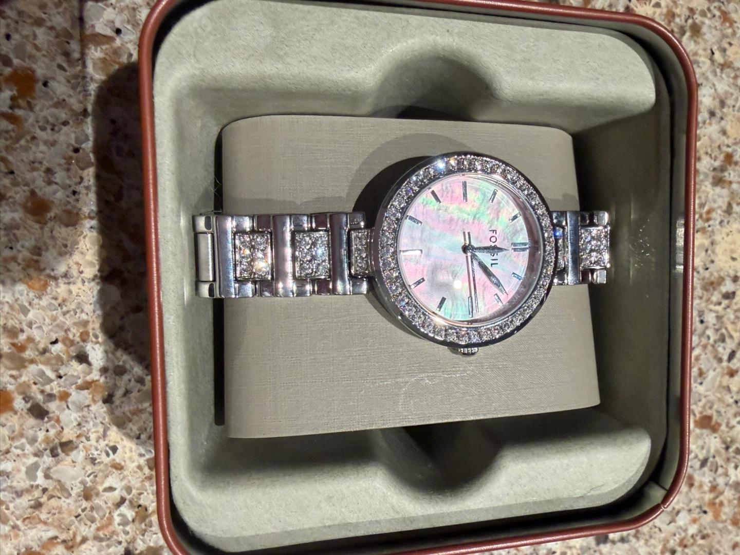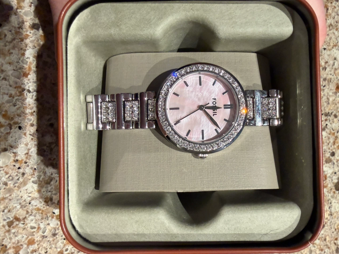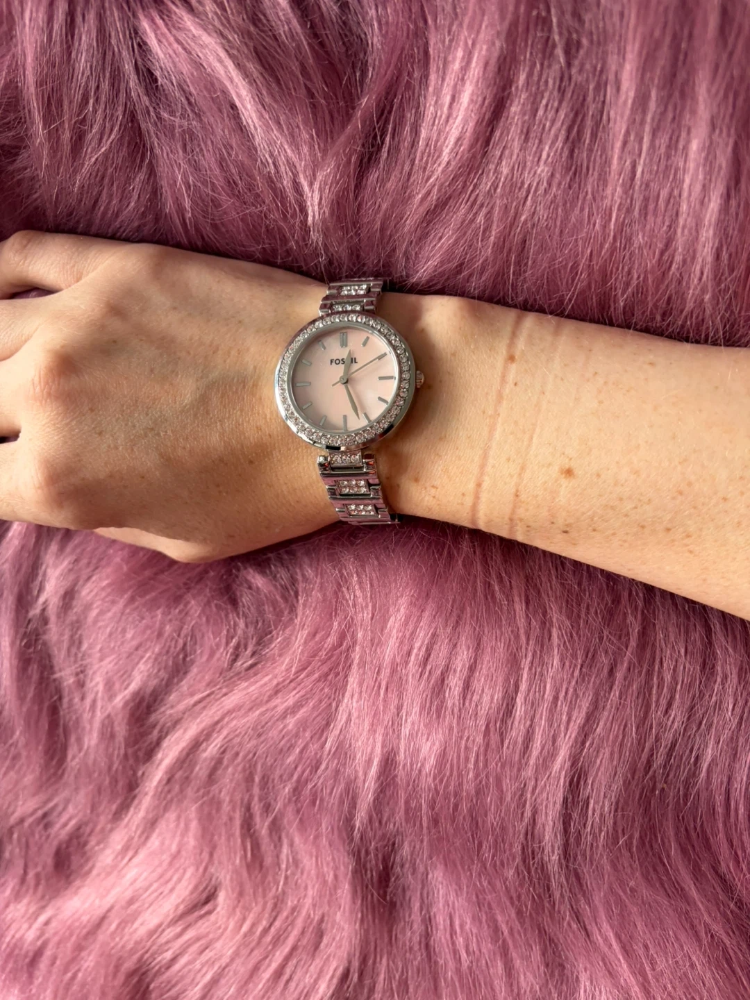 Lovely Fossil ladies' watch featuring a pink mother of pearl dial and a sparkling crystal-embellished bezel. The silver-tone metal band is also accented with crystals. It comes in its original Fossil box, ready for gifting or personal wear!