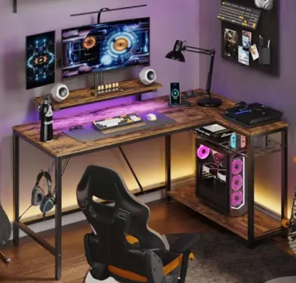 Spacious L-shaped gaming desk. Features a sturdy metal frame and a textured, easy-to-clean surface. Plenty of space for multiple monitors, a PC tower, and accessories.