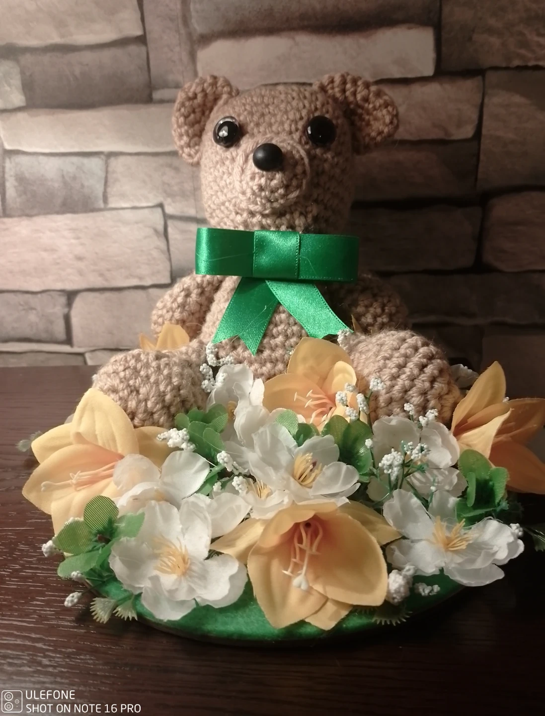 This is a cute crocheted teddy bear, adorned with a festive green bow. It's nestled amongst a colourful arrangement of artificial flowers, featuring white and yellow blossoms. This charming piece would make a lovely decorative accent!
