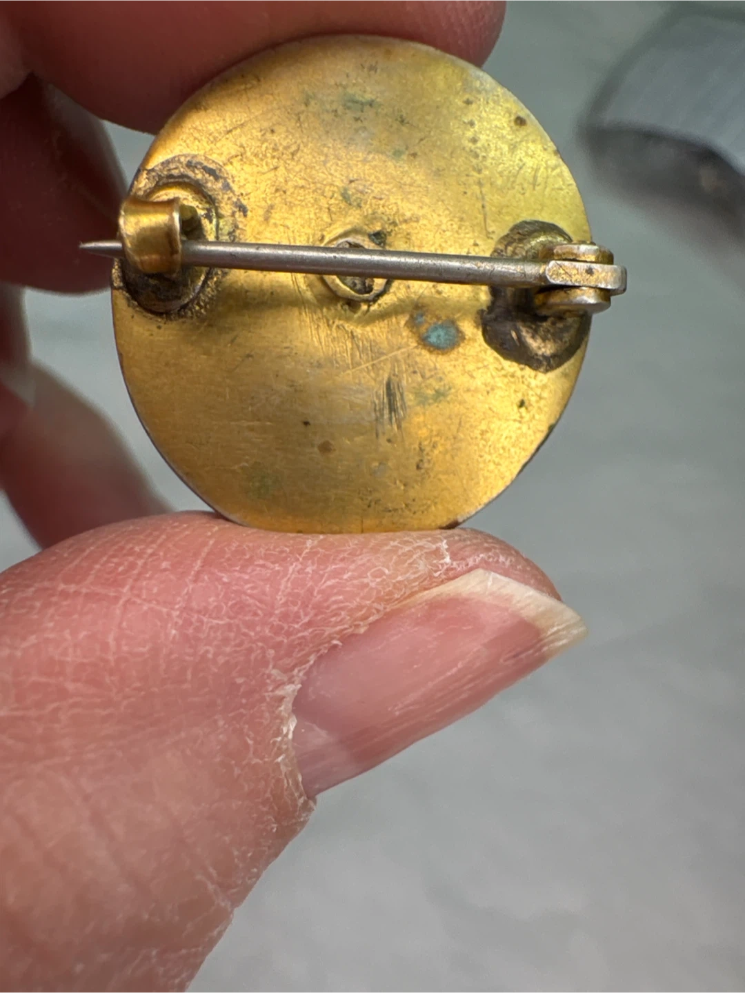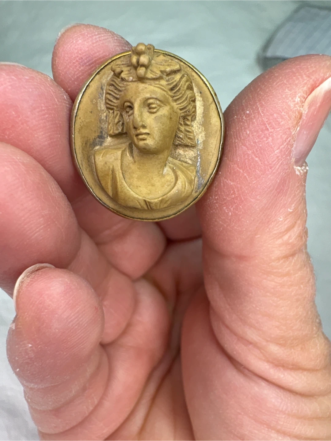 This is an antique ( 1800’s) Lava cameo brooch featuring a carved portrait on a round, gold-toned metal base. It has a classic pin backing. A lovely piece for your collection!