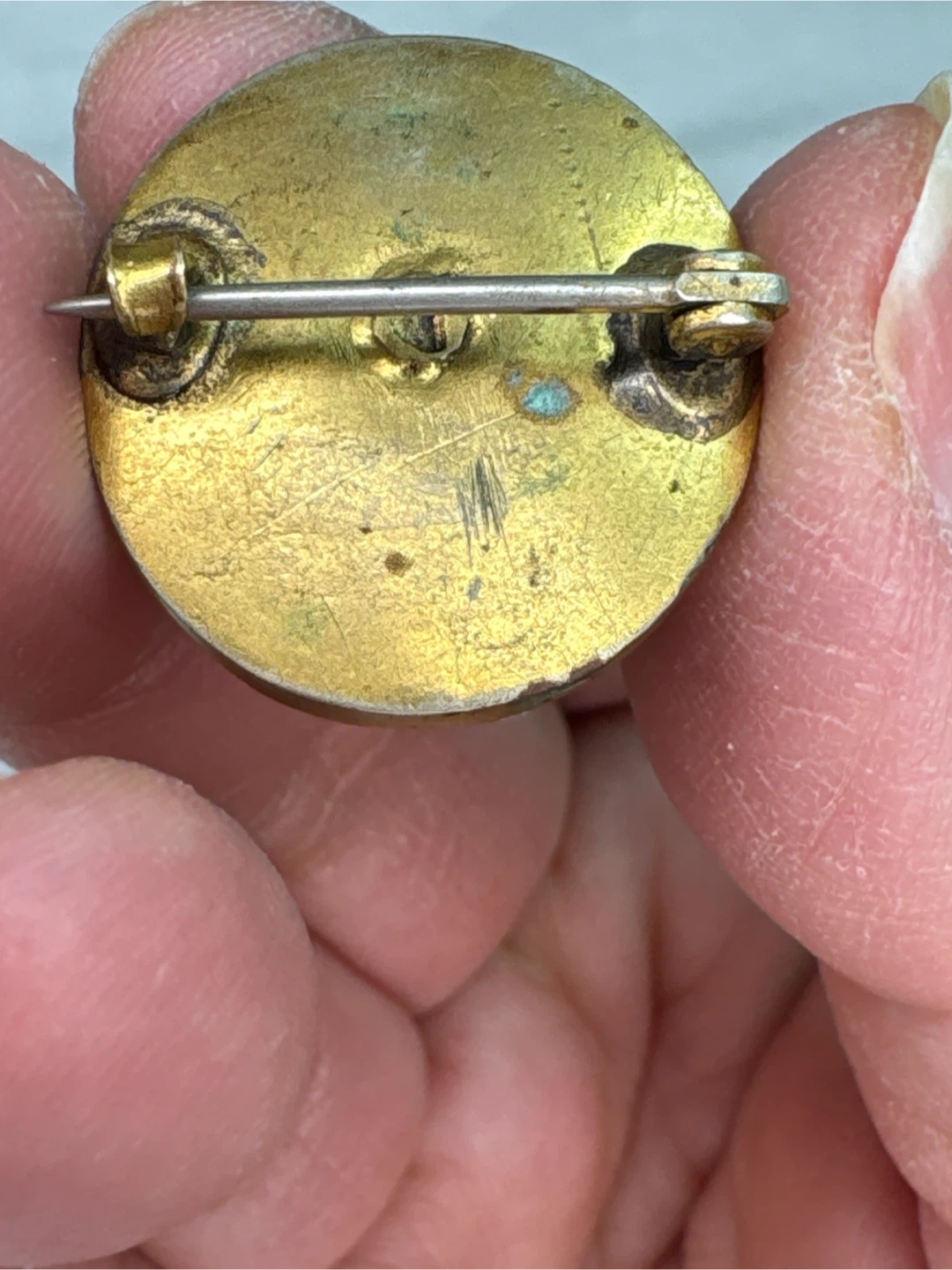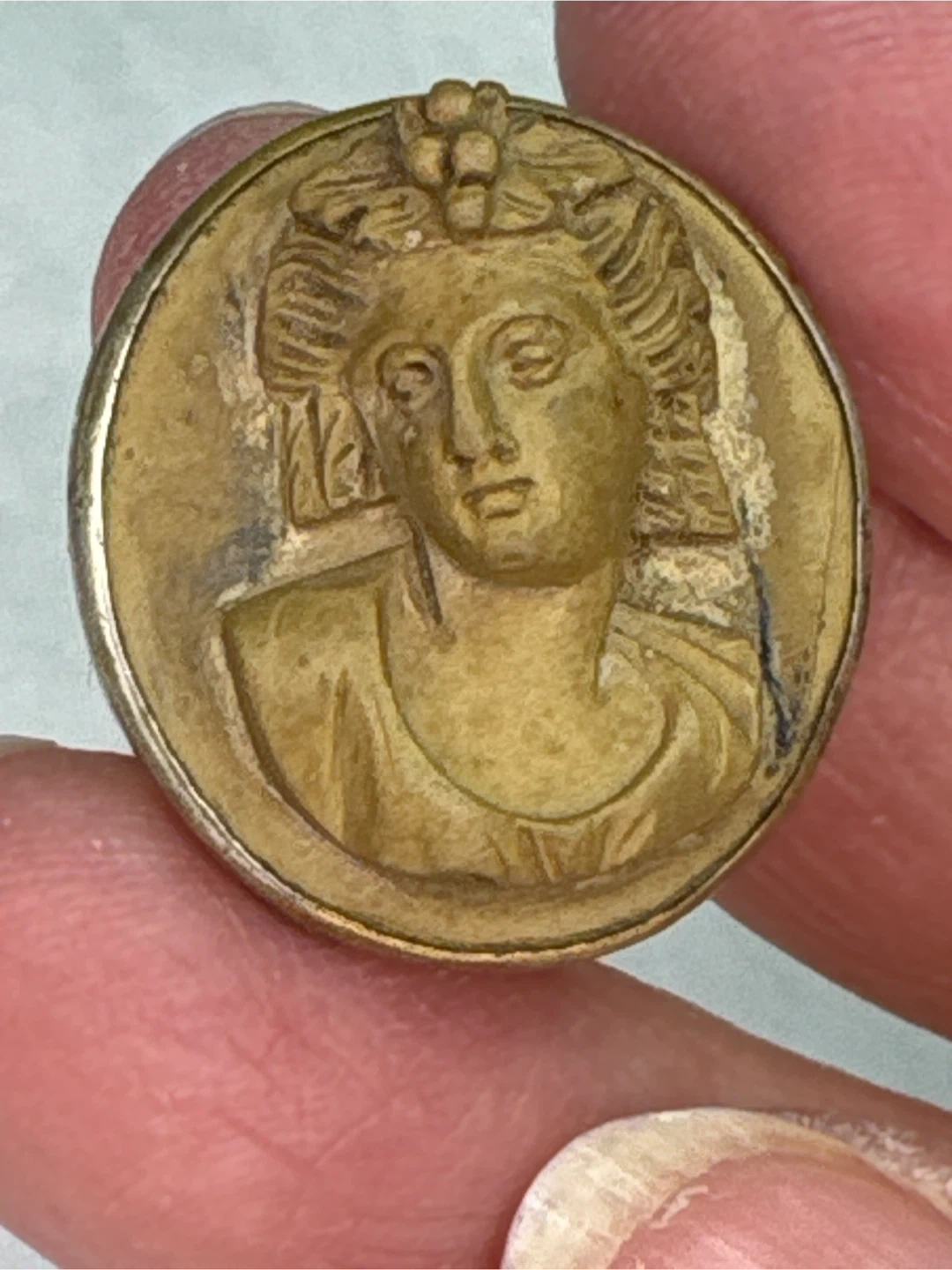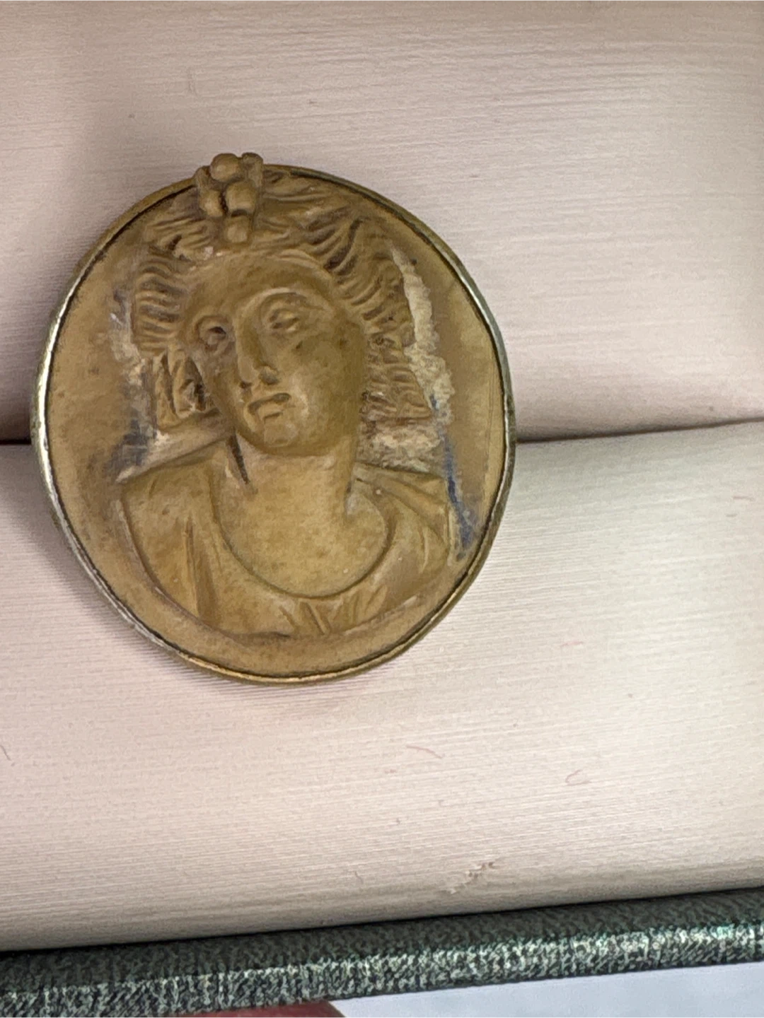 This is an antique ( 1800’s) Lava cameo brooch featuring a carved portrait on a round, gold-toned metal base. It has a classic pin backing. A lovely piece for your collection!