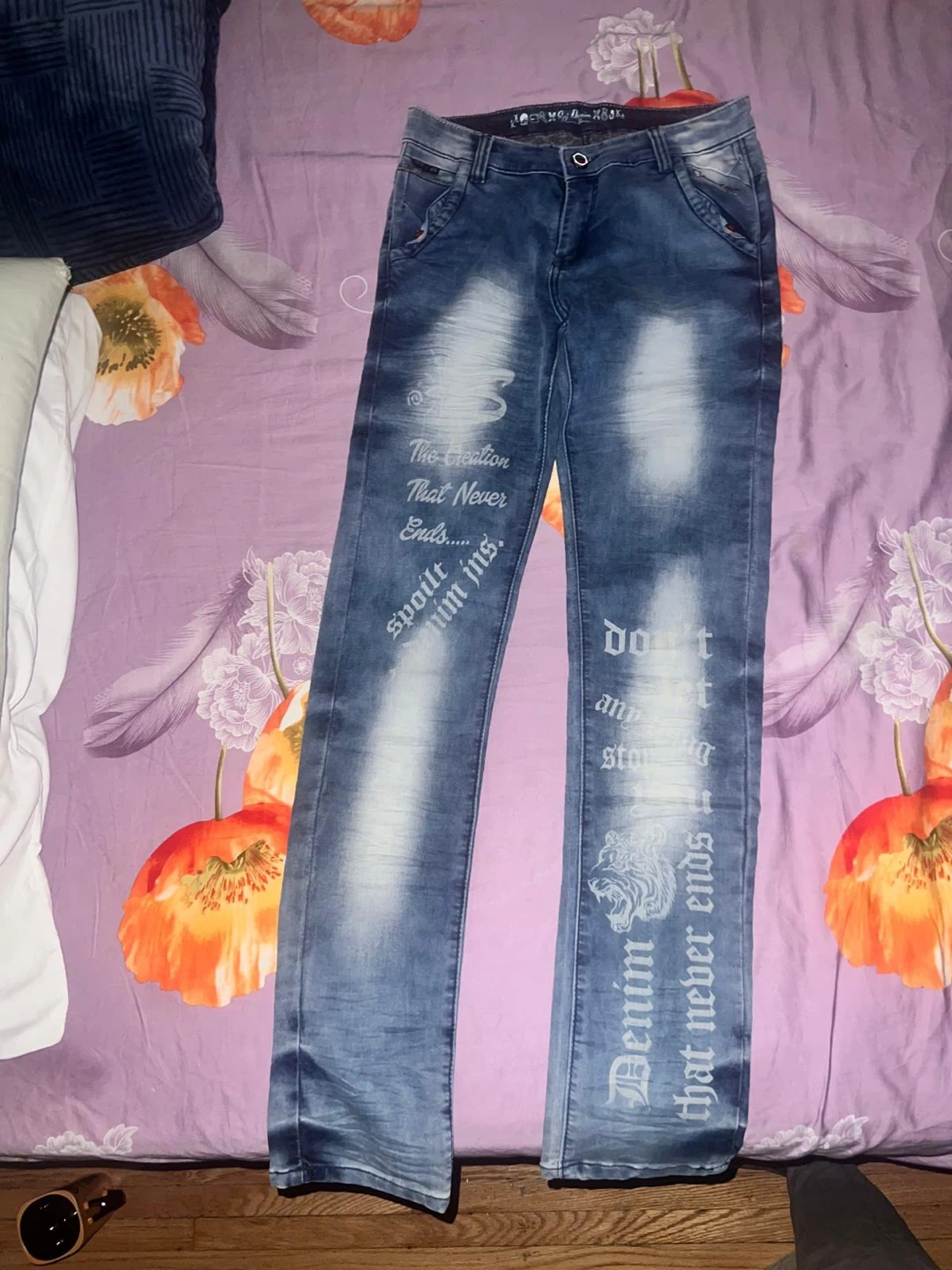 Stylish blue denim jeans featuring distressed detailing and unique graphic prints on the legs. "The Creation That Never Ends" and "Denim that never ends" are printed, along with a tiger graphic. These jeans have a comfortable fit perfect for everyday wear.