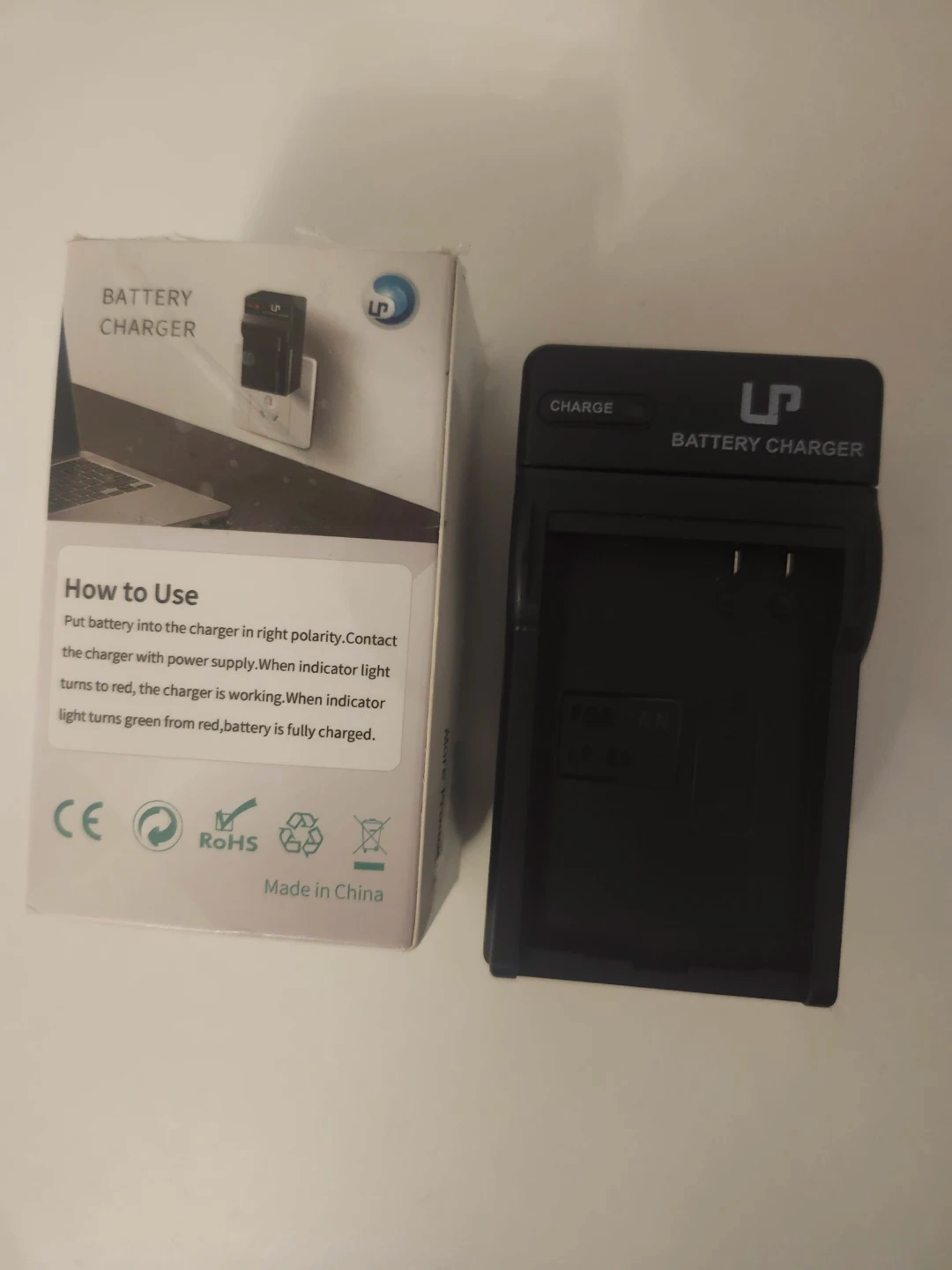 This is an LP LP-E8 battery charger designed for Canon cameras. It supports AC input from 100-240V and outputs DC 4.2V at 600mA. The charger has an indicator light that turns red when charging and green when the battery is fully charged.