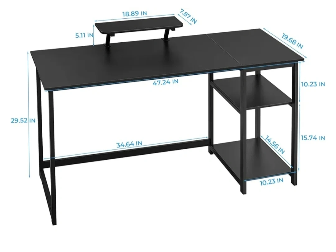 This modern computer desk offers a spacious work surface and built-in storage shelves, perfect for any home office. Its sleek black design complements any decor. Desk dimensions are 47.24" W x 19.68" D x 29.52" H. A great addition for a tidy workspace!