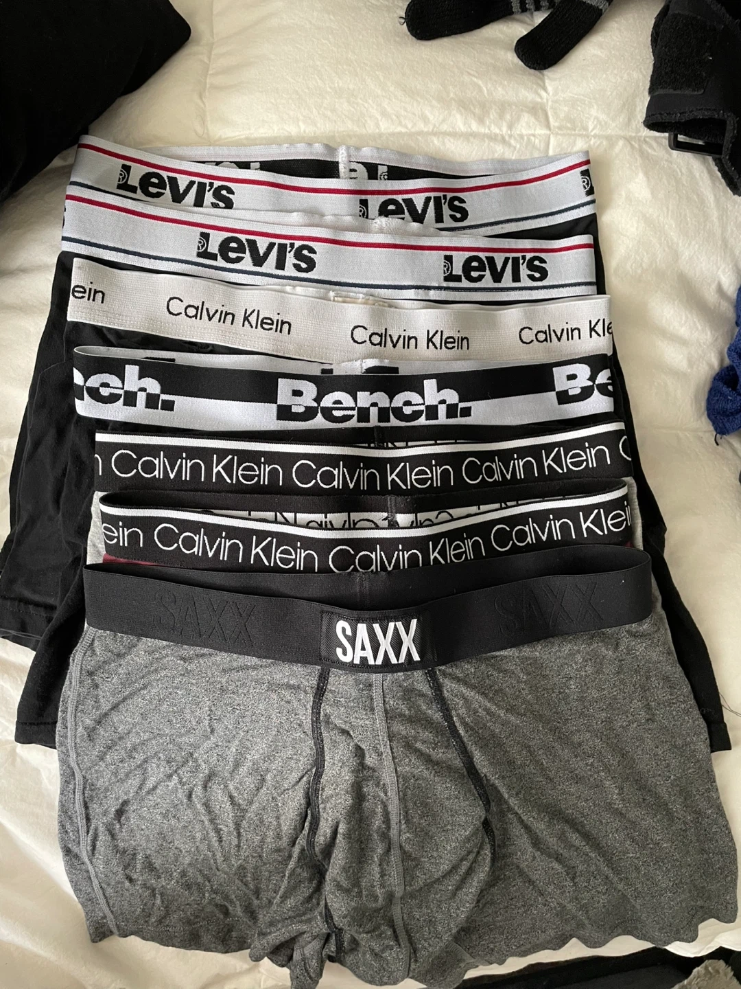 Bundle includes Levi's, Calvin Klein, Bench, and Saxx underwear. Also includes a pair of striped gloves and a black phone case with a clear case. Great value for everyday essentials!