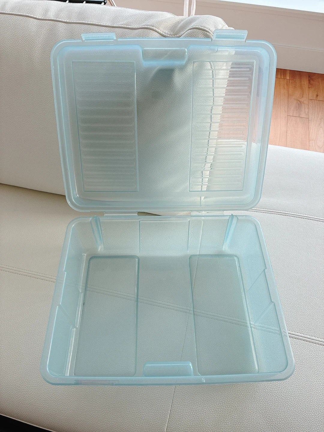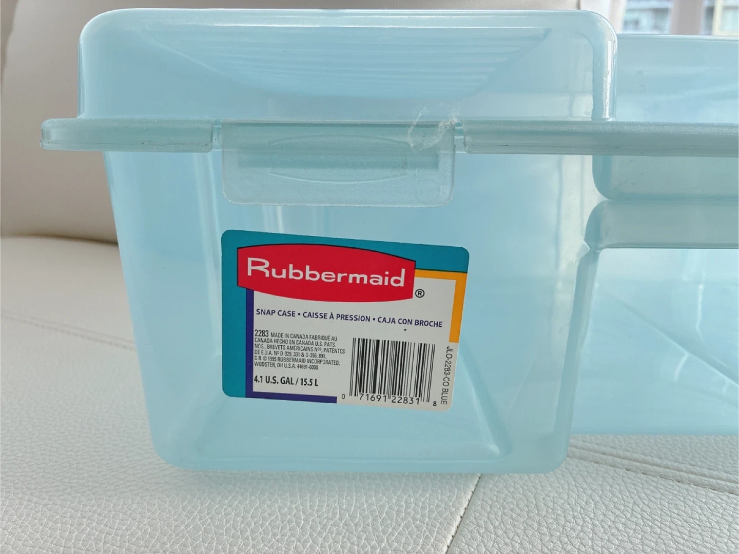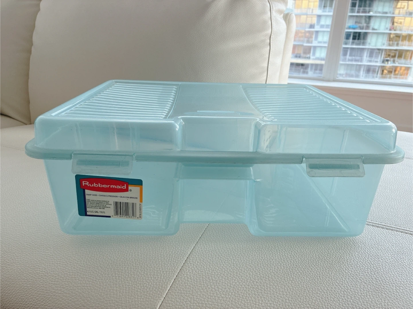 Rubbermaid blue snap case. Features snap-on lid for secure closure. Holds 4.1 U.S. gallons or 15.5 litres. Great for organizing crafts, toys, or other household items!