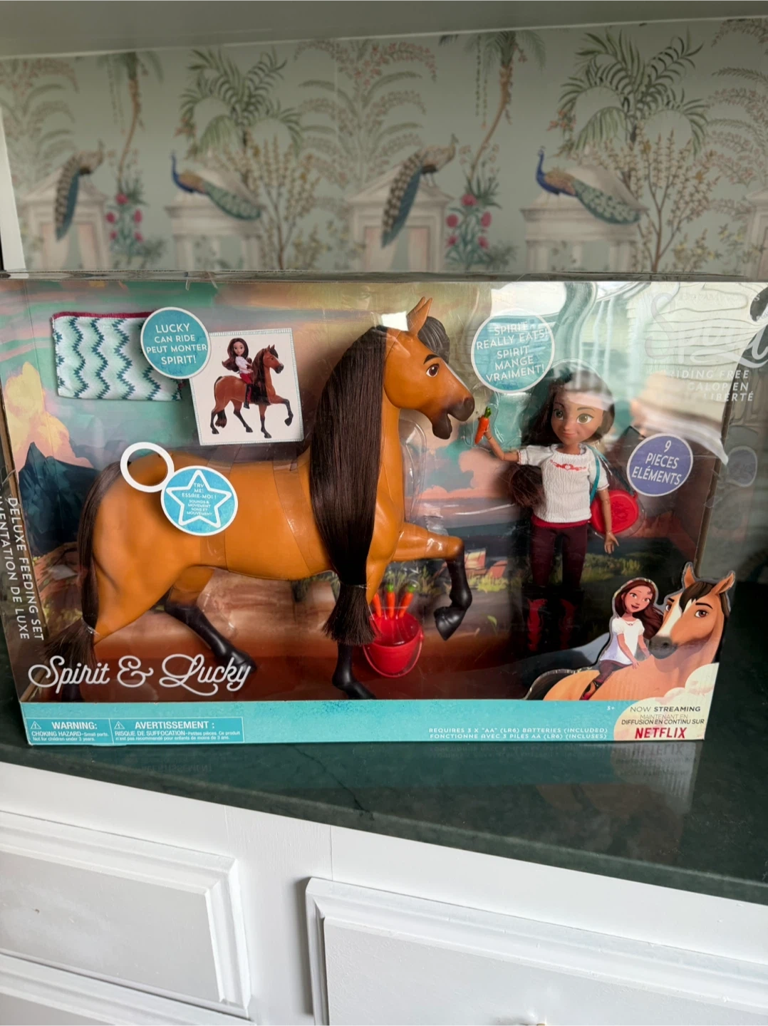 This Spirit & Lucky Deluxe Feeding Set features a doll and a horse. It includes 9 pieces for interactive play, and the horse 'really eats'! Requires 2 'AA' batteries, not included. Fun for any Spirit Riding Free fan!
