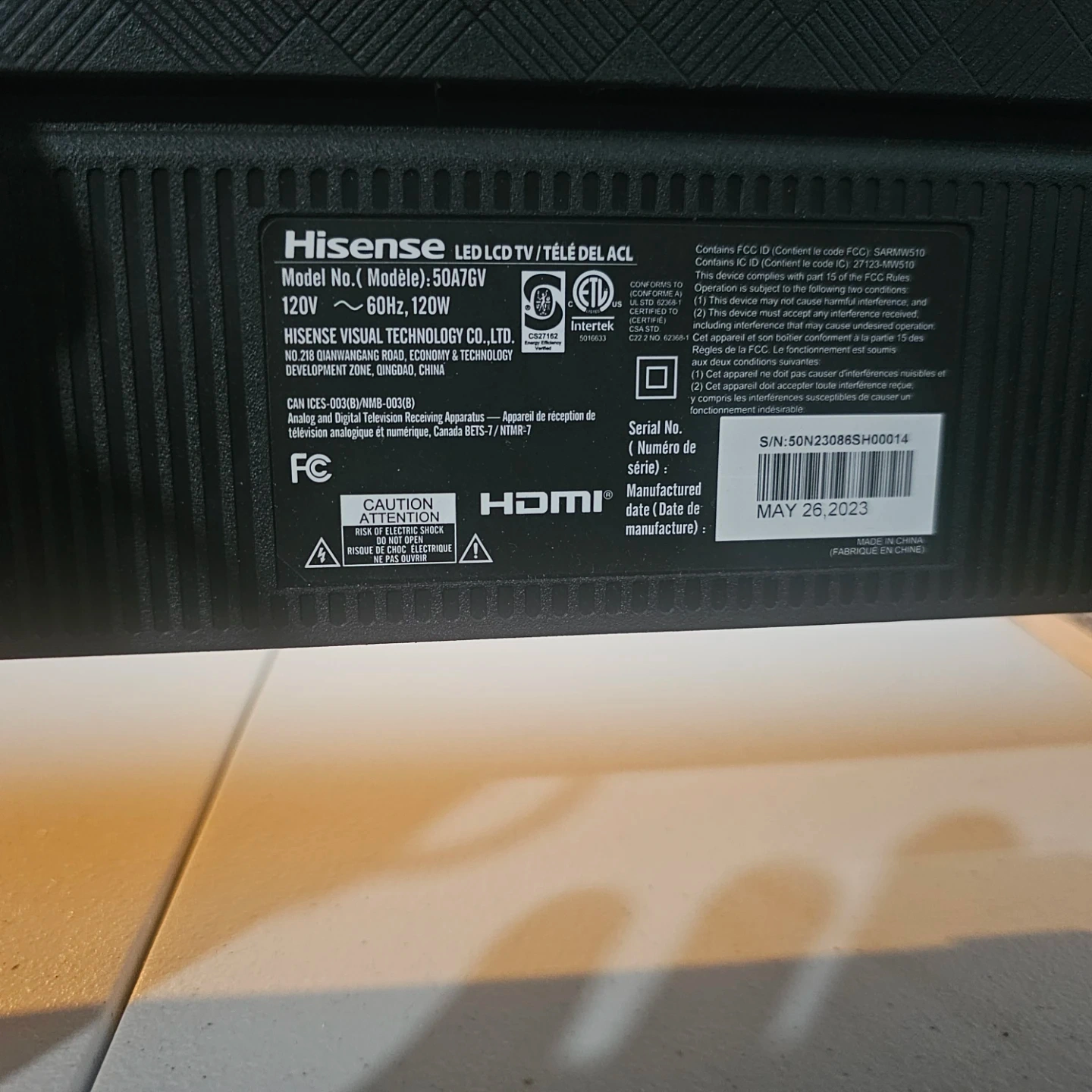 This is a Hisense 50A76V LED LCD TV, manufactured on May 26, 2023. It's a 50-inch screen that runs on 120V and uses 60Hz, with a power consumption of 120W. It's in great condition and ready for a new home!