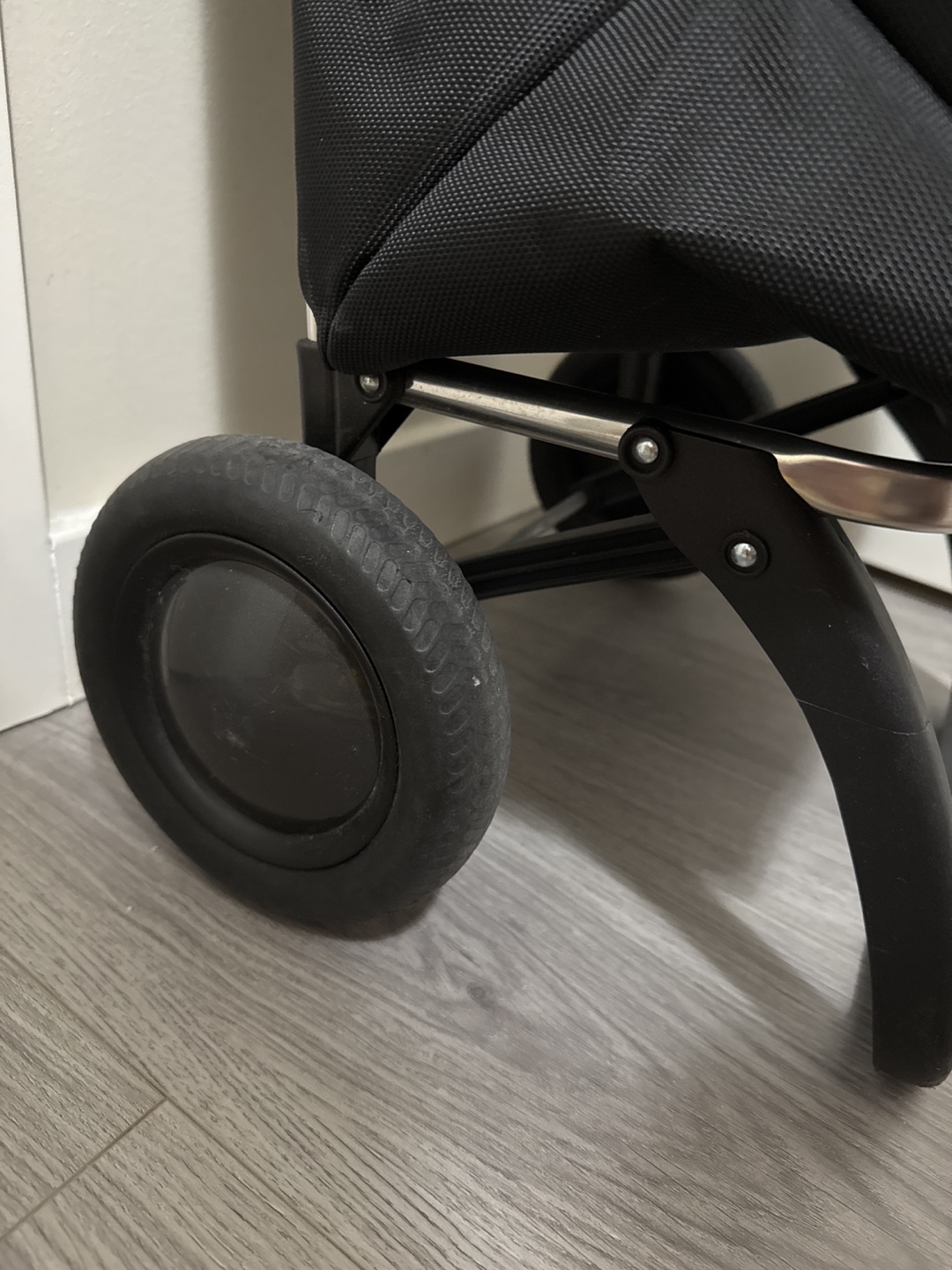 Black shopping cart with a foldable frame and large wheels. Has a zippered pocket on the front and a drawstring closure at the top.