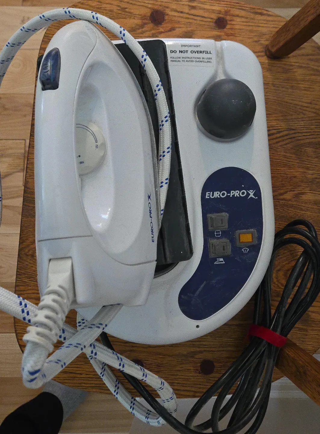 Iron with a white and blue design. A power cord, with a red velcro tie, and a water line. Perfect for achieving a crisp, smooth look. Iron with boiler underneath. Also steams clothing.