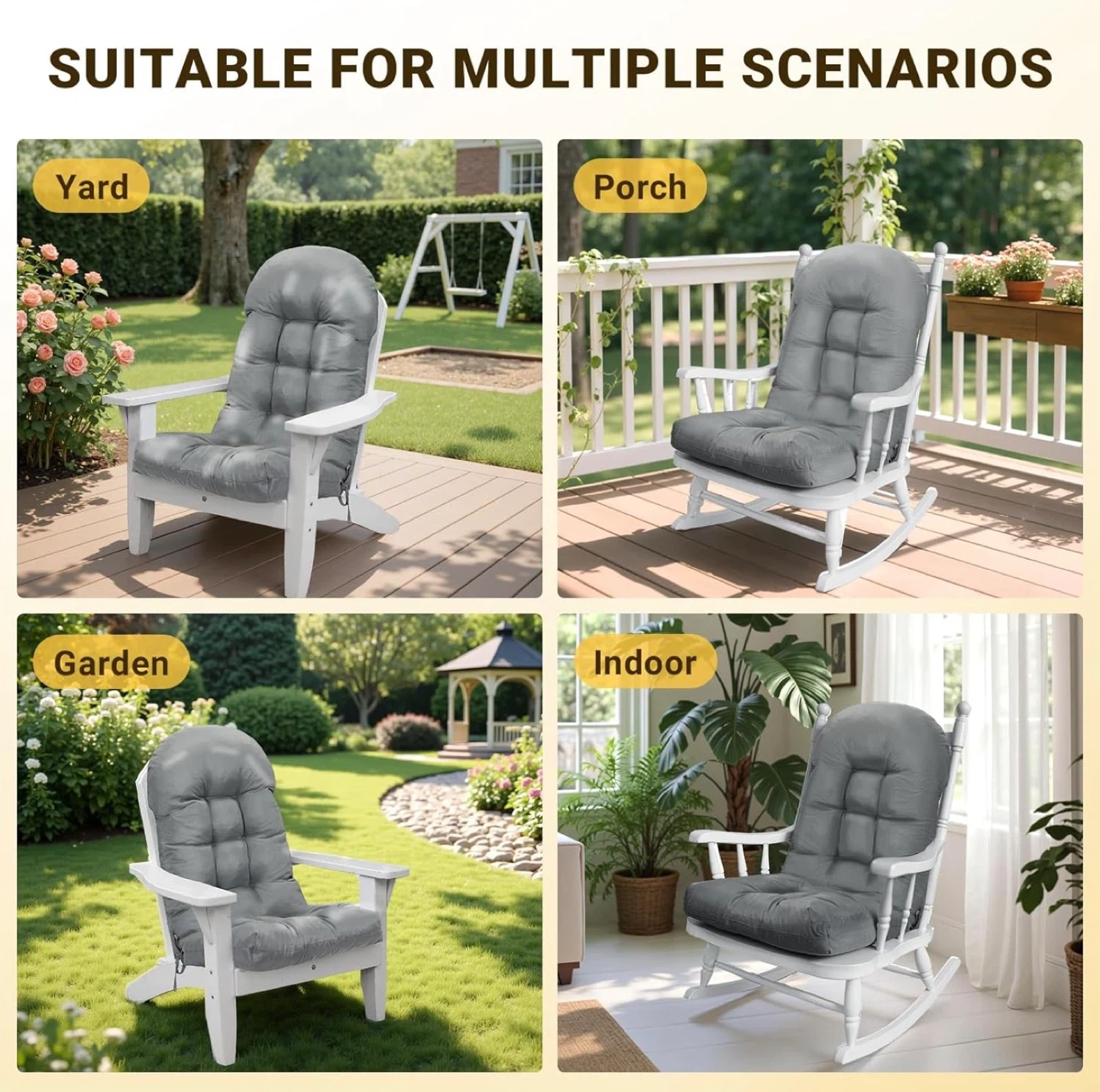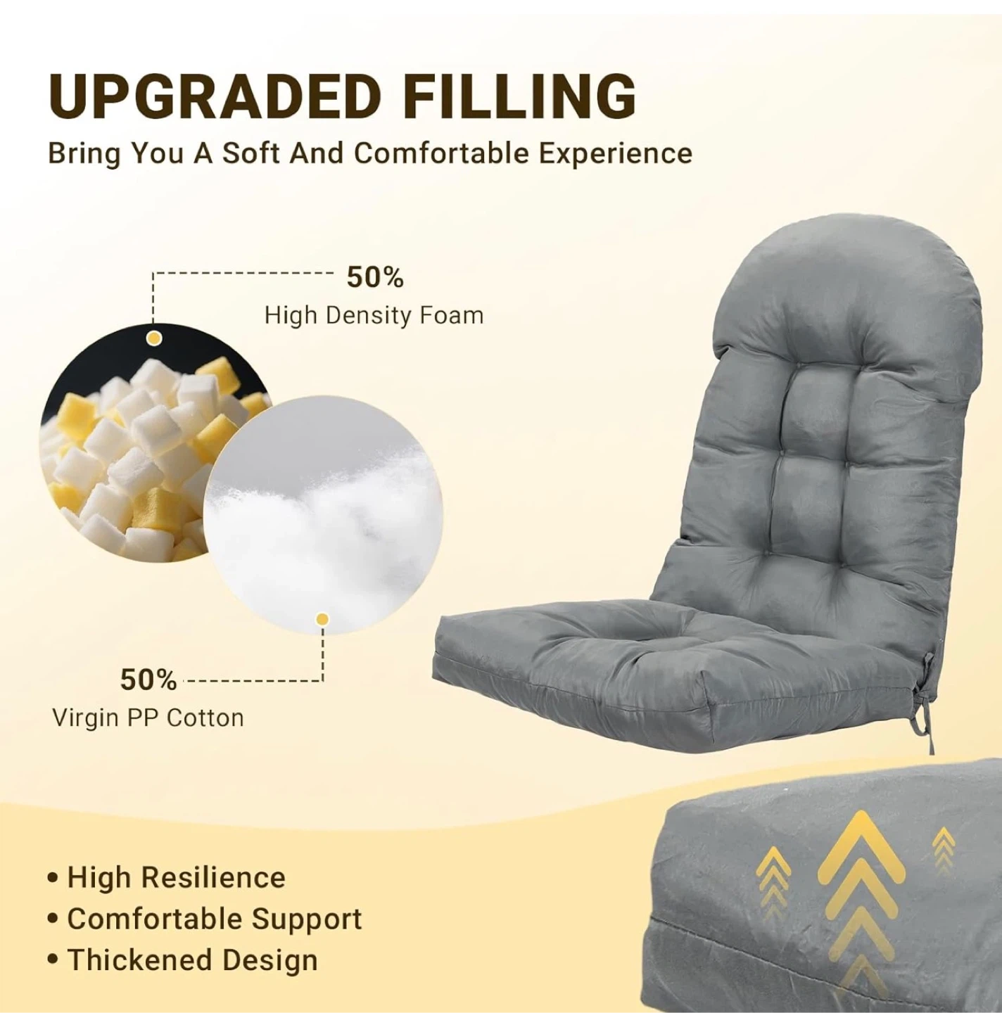 This set includes two high-back chair cushions in dark gray. They're made with a thickened design and feature upgraded filling with 50% high-density foam and 50% virgin PP cotton. The fabric is UV fade-resistant and water-resistant, making them suitable for outdoor use. These cushions offer high resilience and comfortable support.